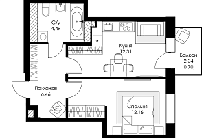 Однокомнатная квартира №22 с предчистовой отделкой, Корпус 2, Секция 1