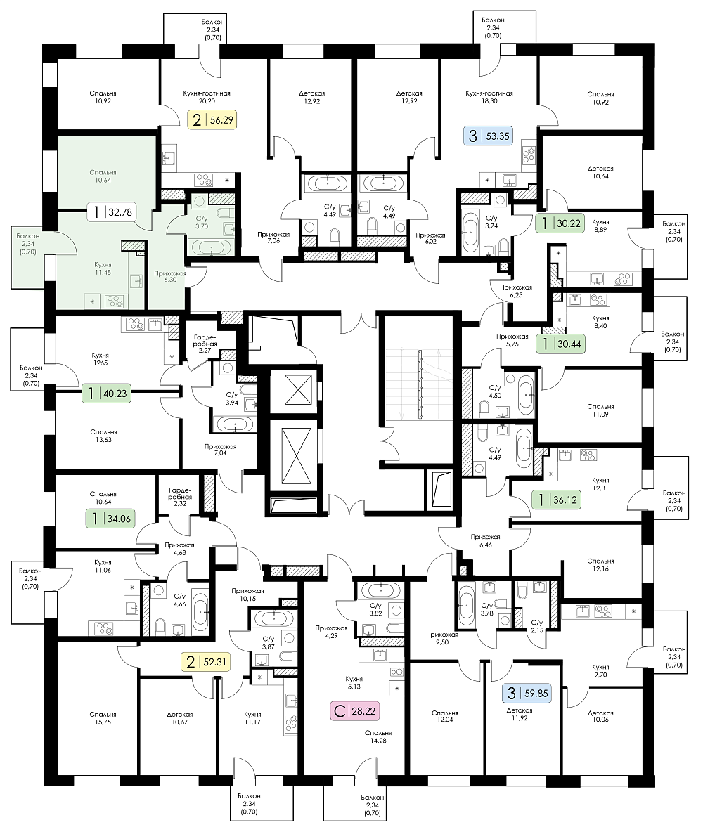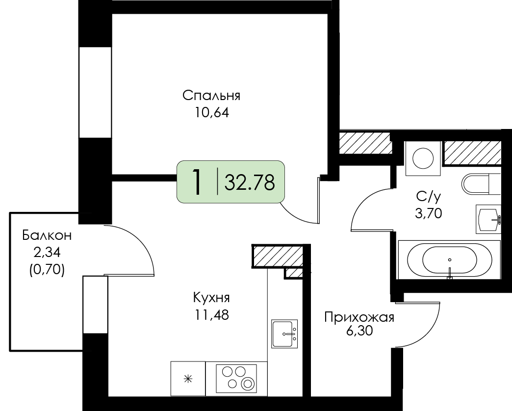 Однокомнатная квартира №127 с предчистовой отделкой, Корпус 2, Секция 1