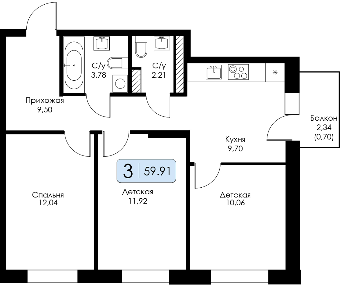 Трехкомнатная квартира №23 с предчистовой отделкой, Корпус 2, Секция 1
