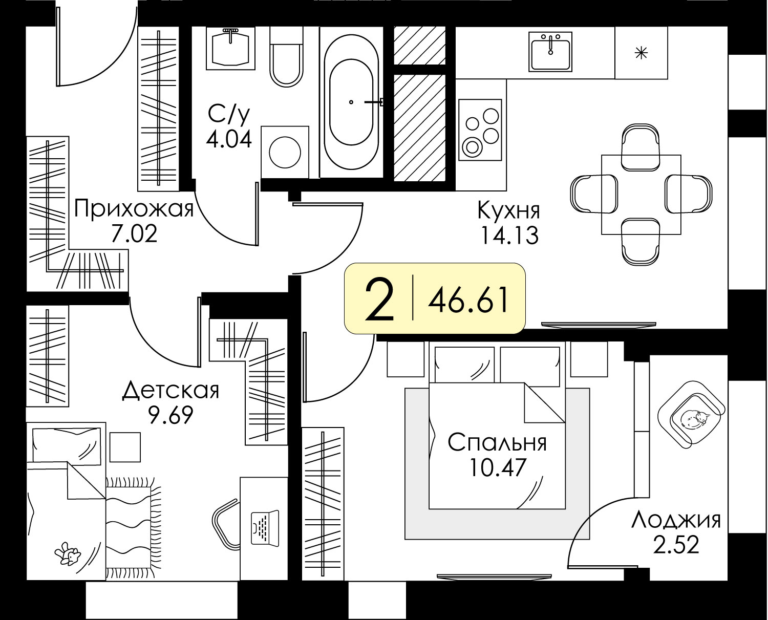 Двухкомнатная квартира №149 с предчистовой отделкой, Корпус 1, Секция 1
