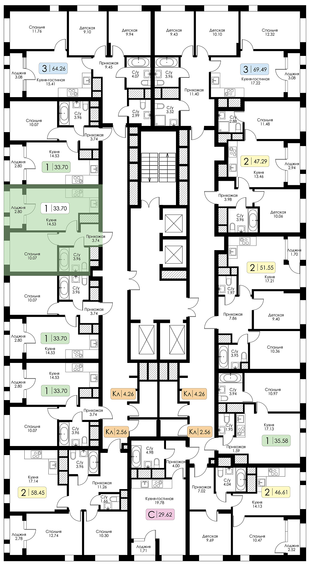 Однокомнатная квартира №94 с предчистовой отделкой, Корпус 1, Секция 1