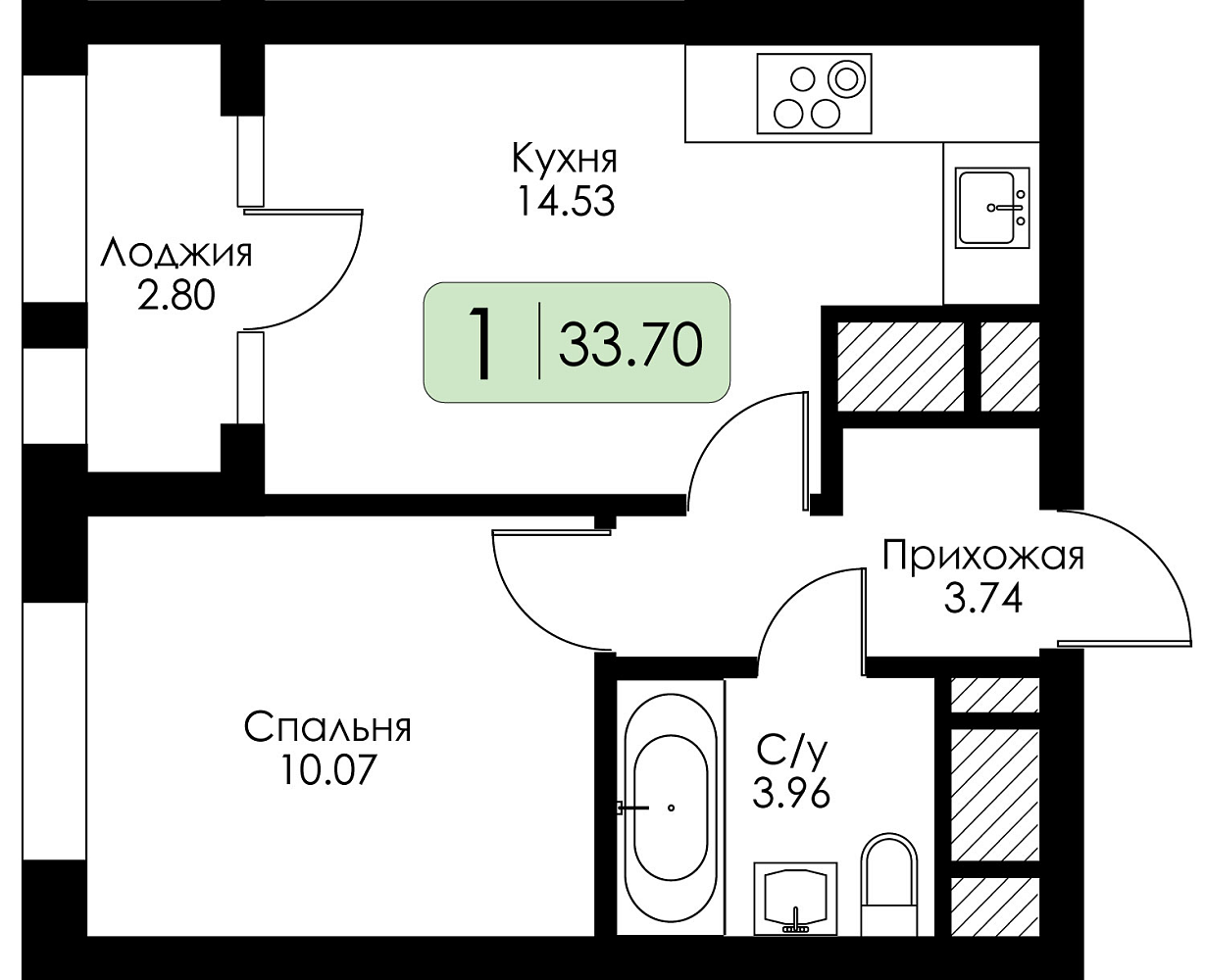 Однокомнатная квартира №200 с чистовой отделкой, Корпус 1, Секция 1