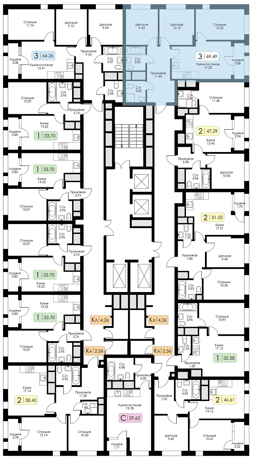 Трехкомнатная квартира №169, Корпус 1, Секция 1