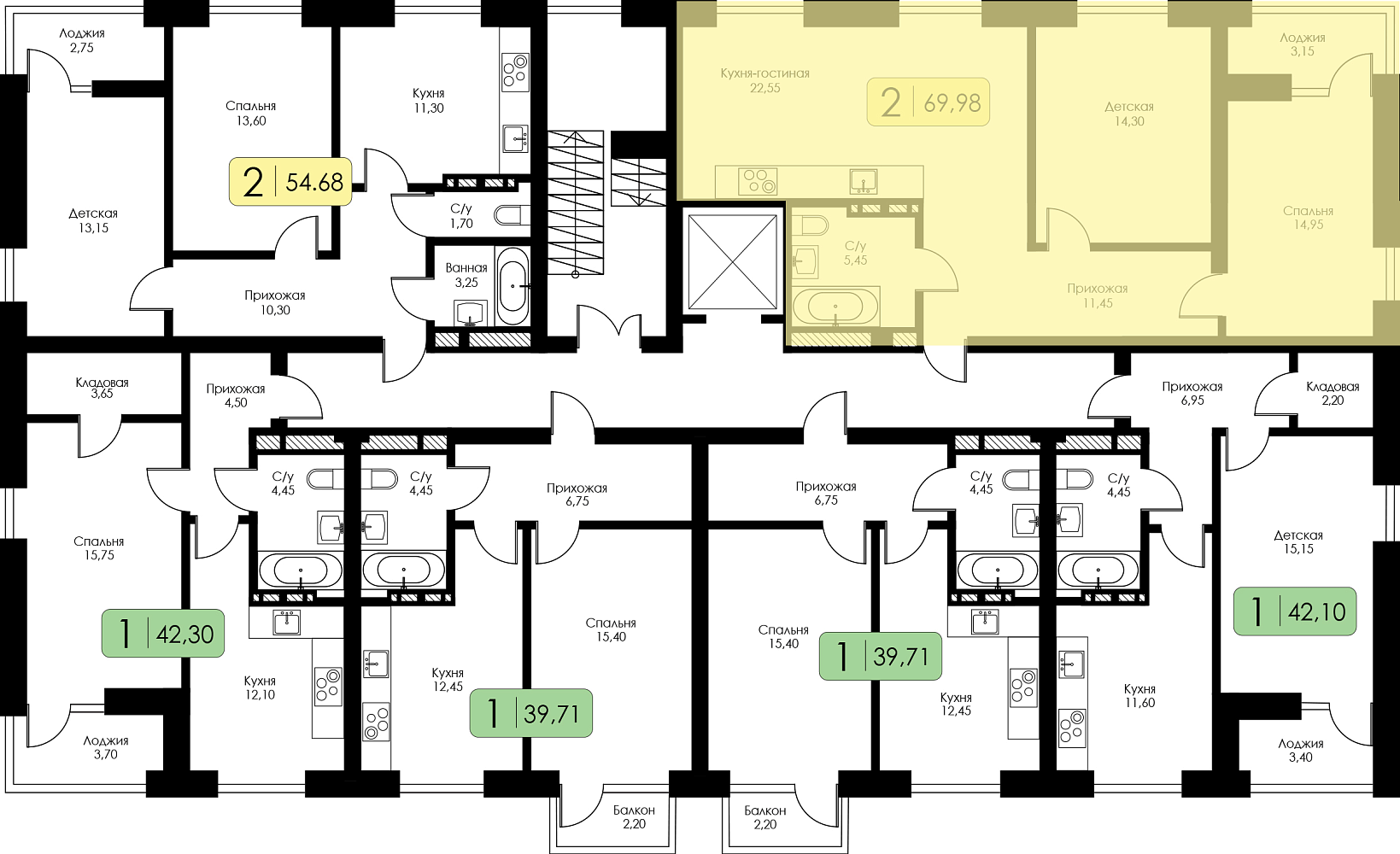 Двухкомнатная квартира №205 c черновой отделкой, Корпус А, Секция 4
