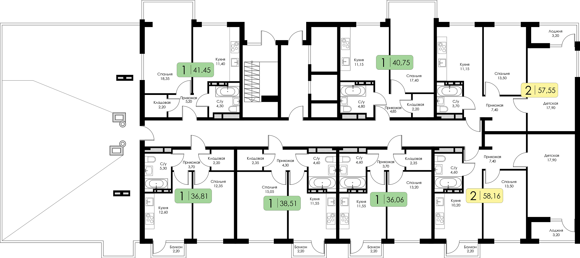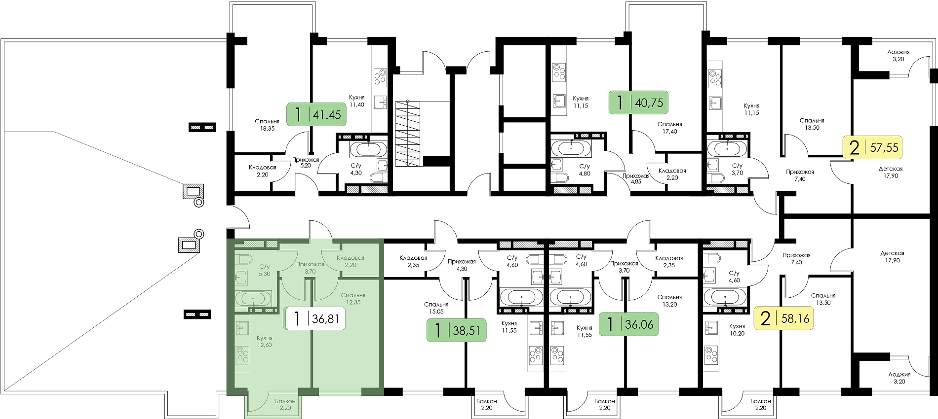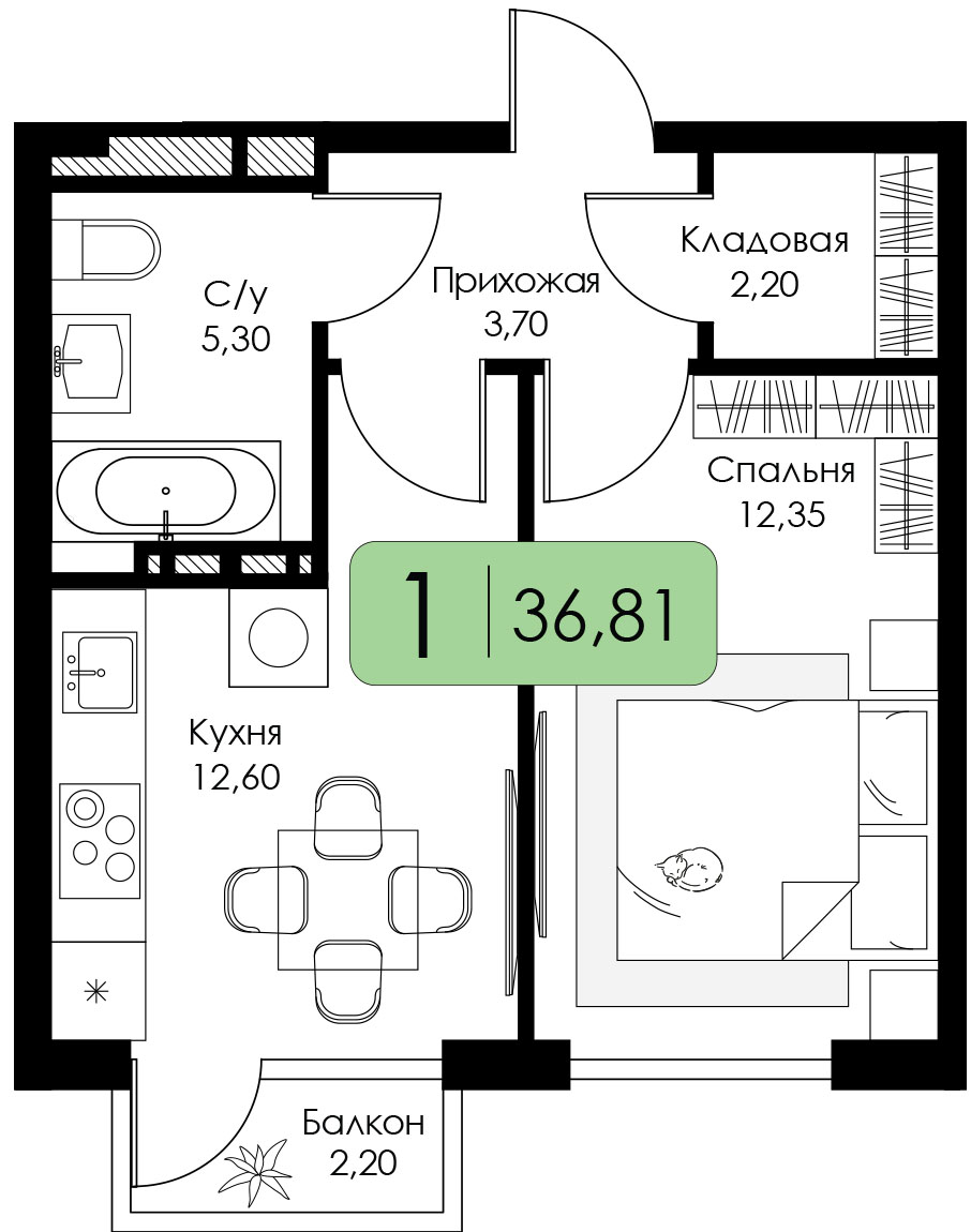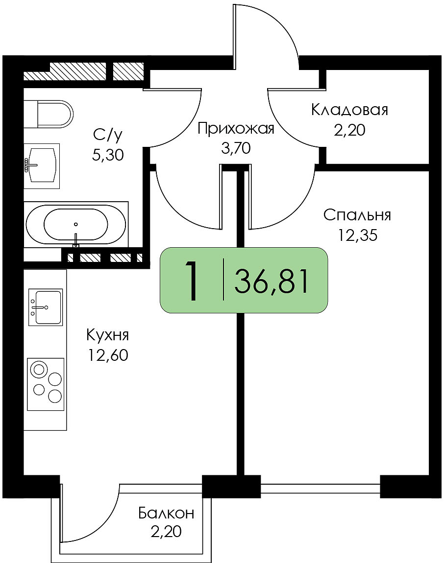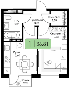 Однокомнатная квартира №51 c черновой отделкой, Корпус А, Секция 1