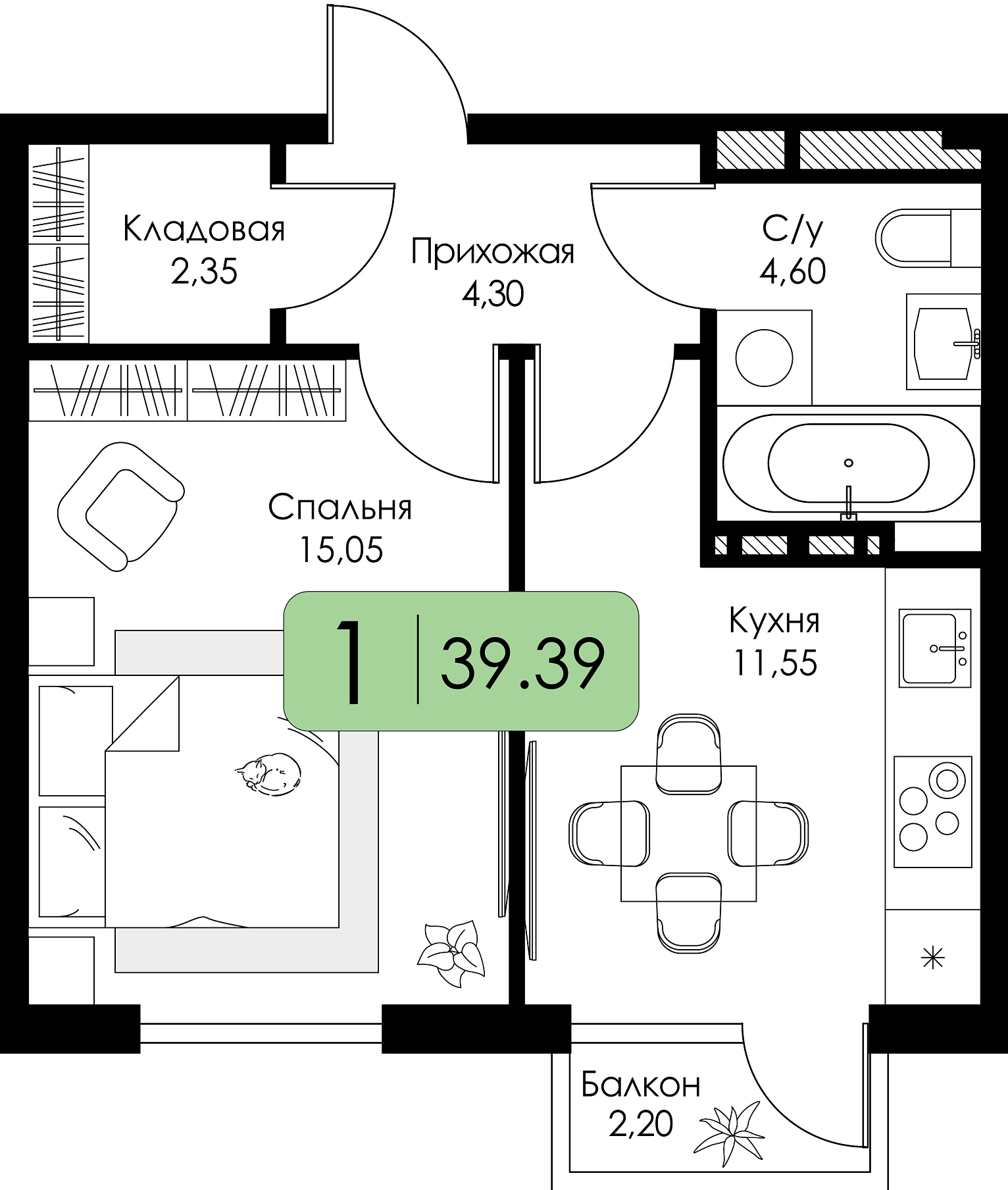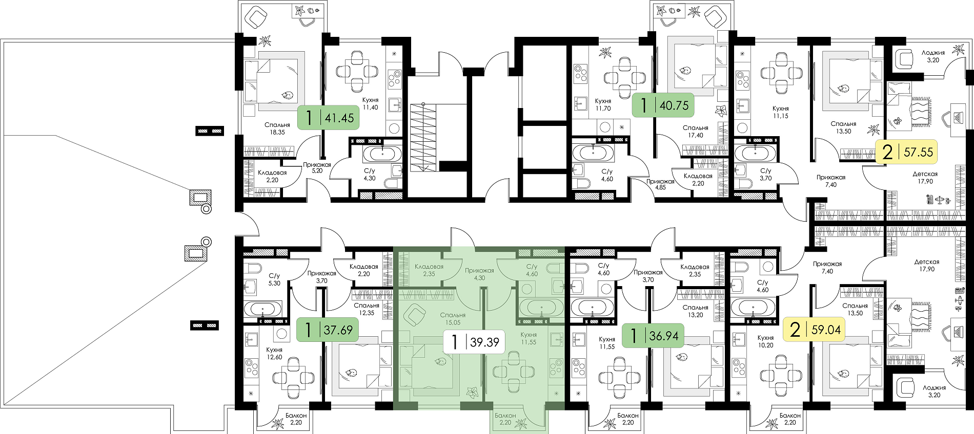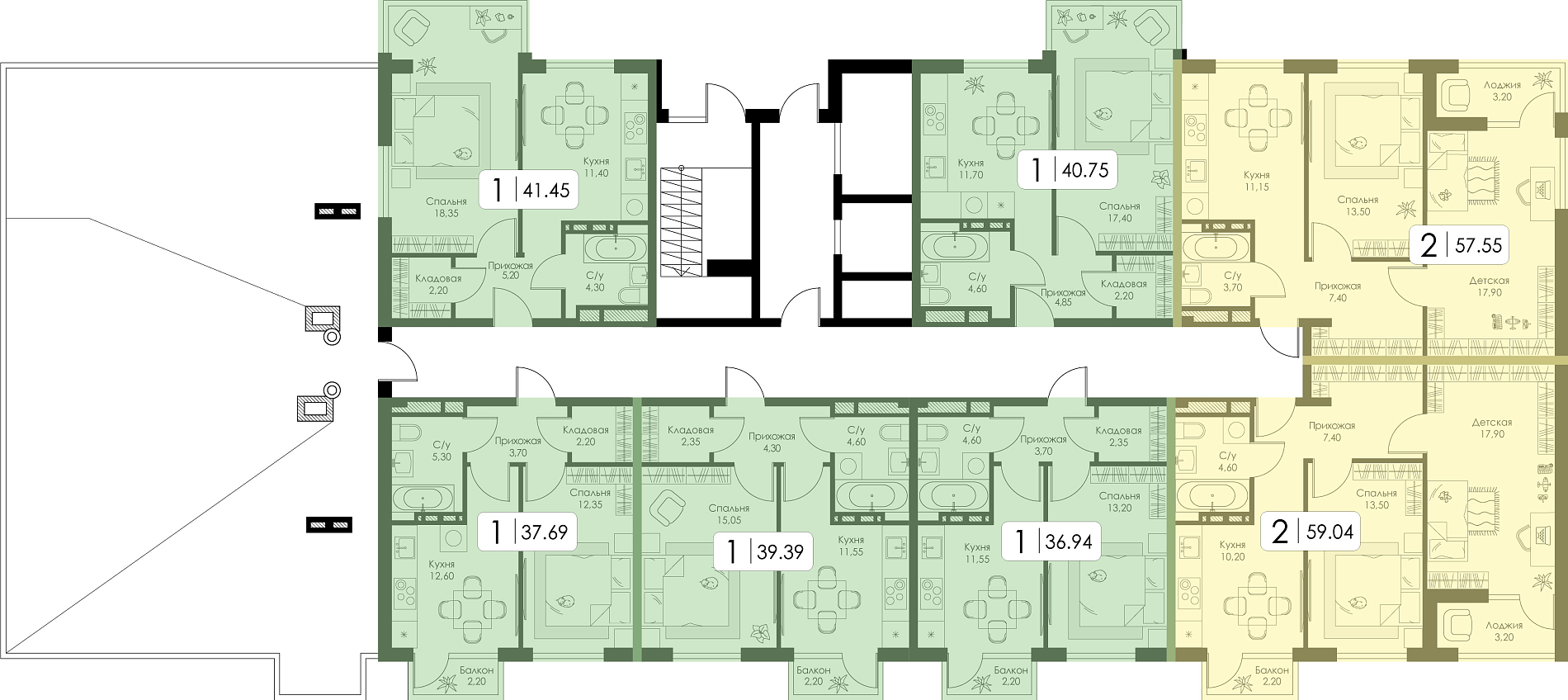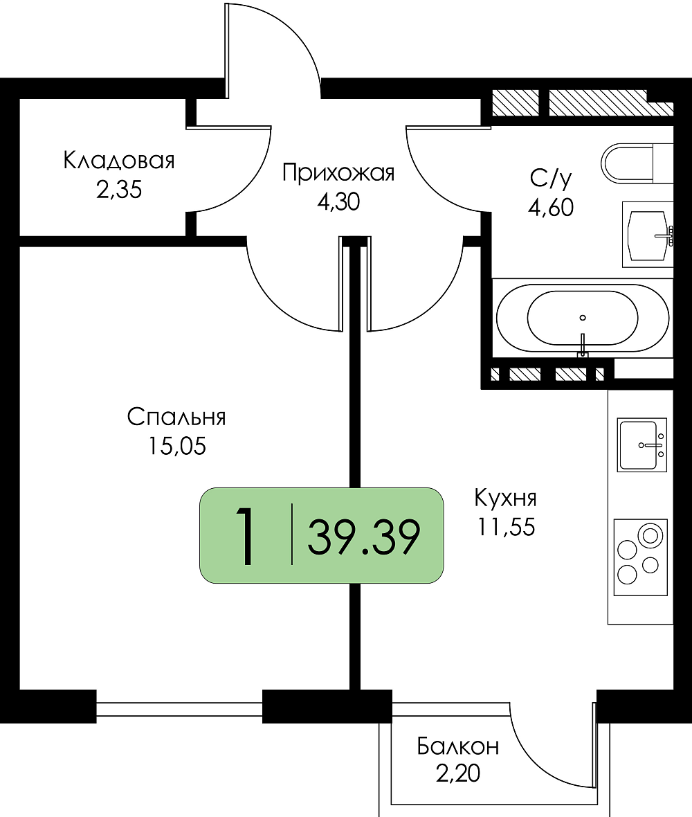 Однокомнатная квартира №106 c черновой отделкой, Корпус А, Секция 1