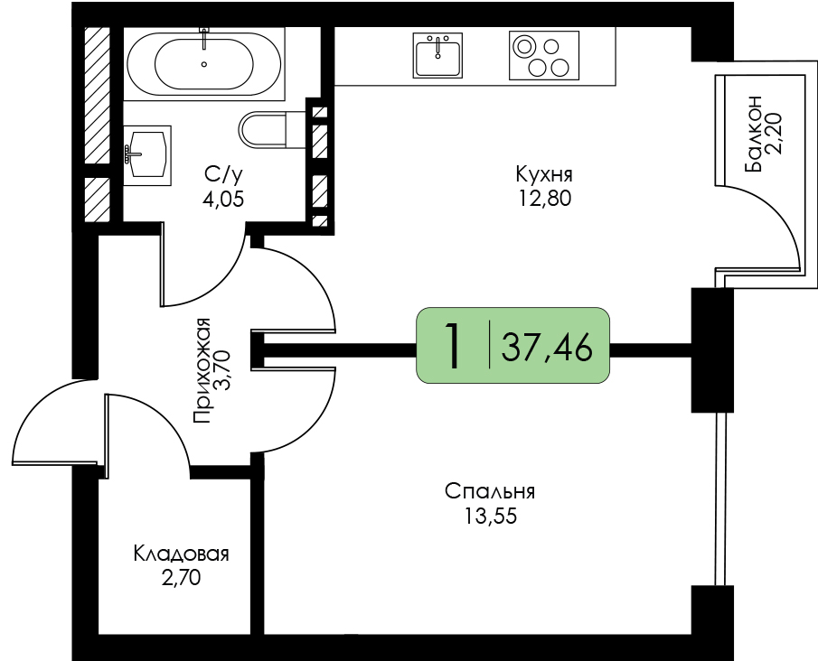 Однокомнатная квартира №144 c черновой отделкой, Корпус А, Секция 3