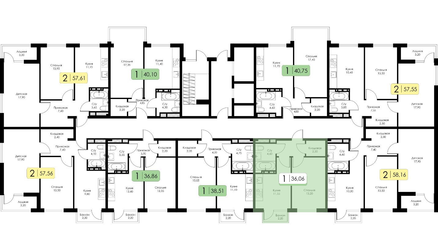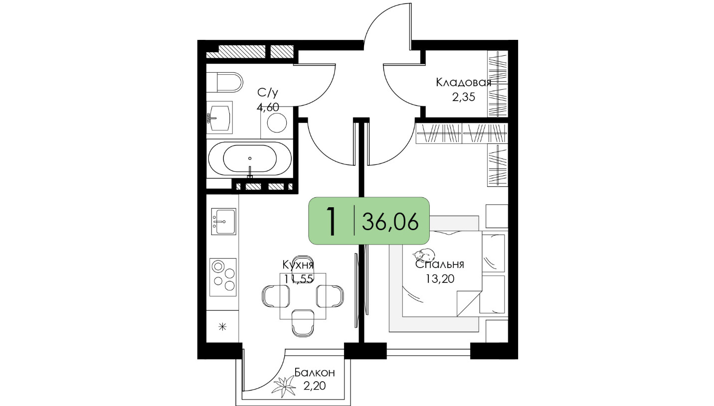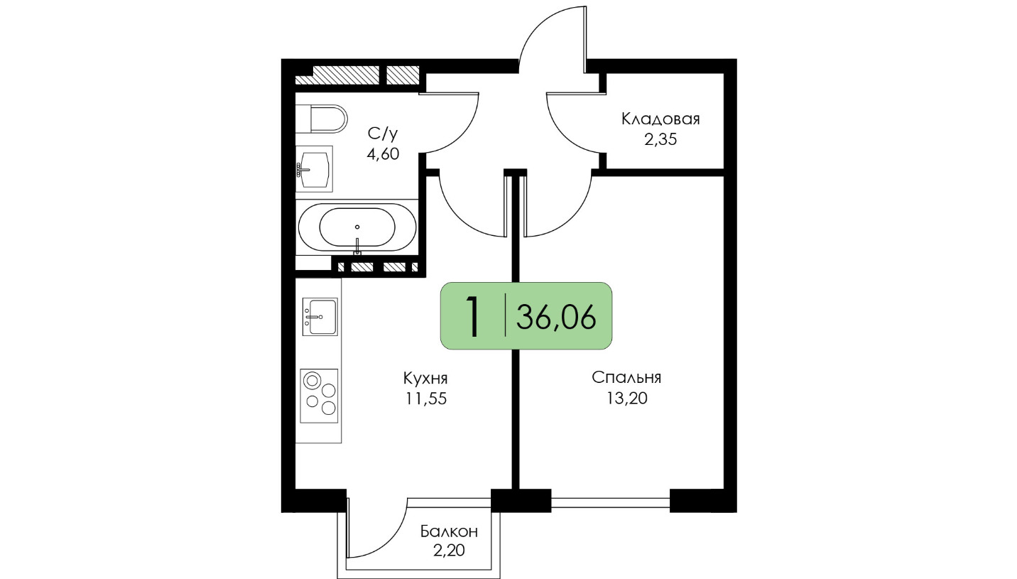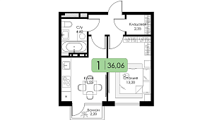 Однокомнатная квартира №13 c черновой отделкой, Корпус Корпус А, Секция 1