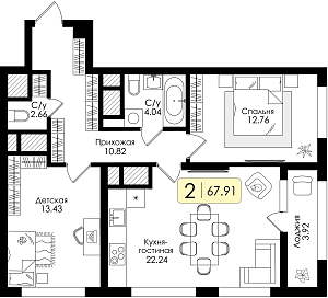 Двухкомнатная квартира №176 с чистовой отделкой, Корпус 1, Секция 1