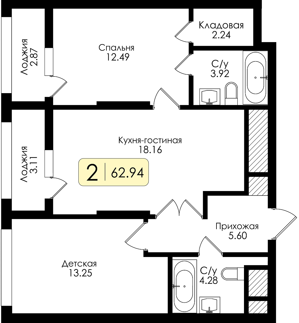 Двухкомнатная квартира №218 с предчистовой отделкой, Корпус 1, Секция 1