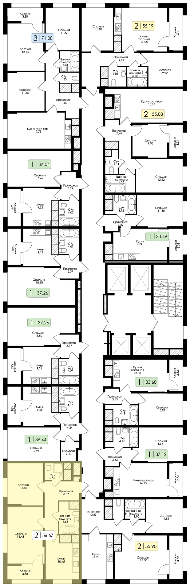 Двухкомнатная квартира №88 с чистовой отделкой, Корпус 2, Секция 1