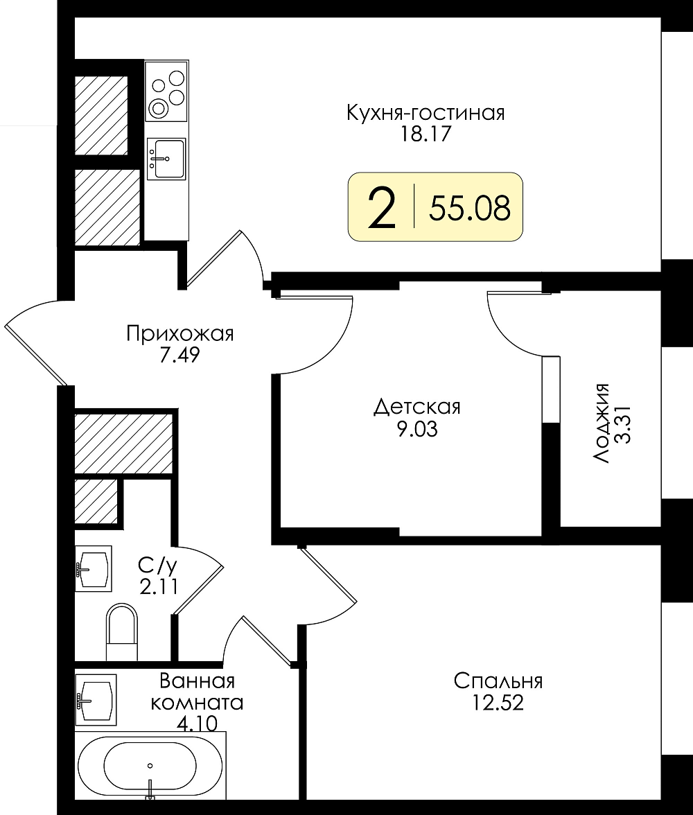 Двухкомнатная квартира №155 с чистовой отделкой, Корпус 2, Секция 1
