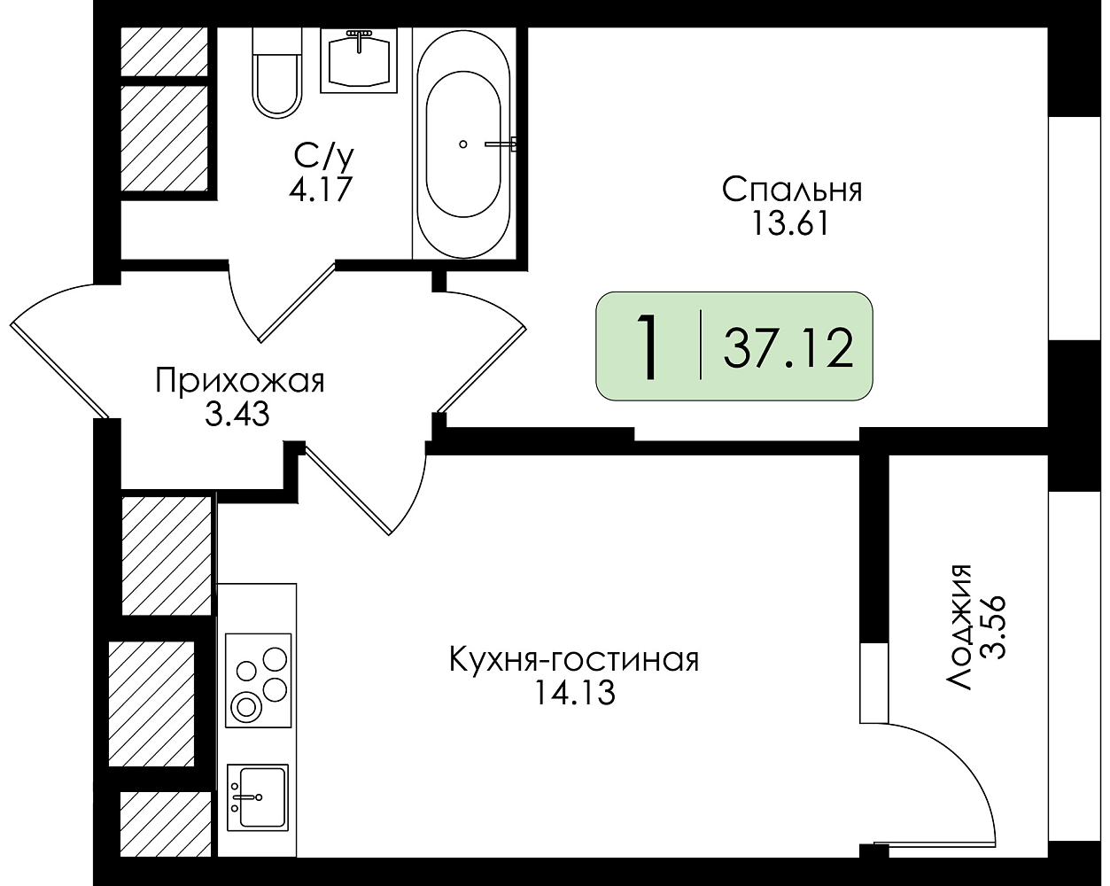 Однокомнатная квартира №86 с чистовой отделкой, Корпус № 2