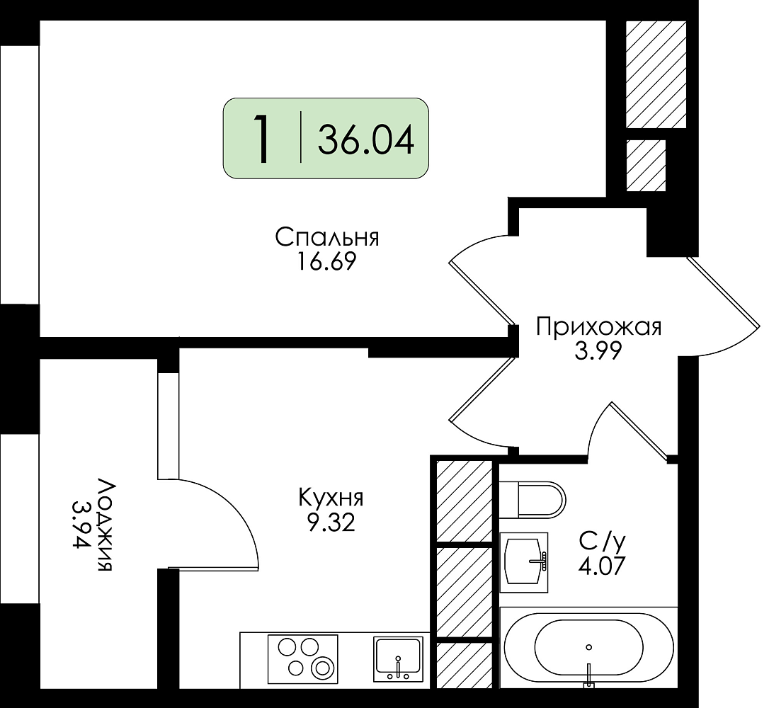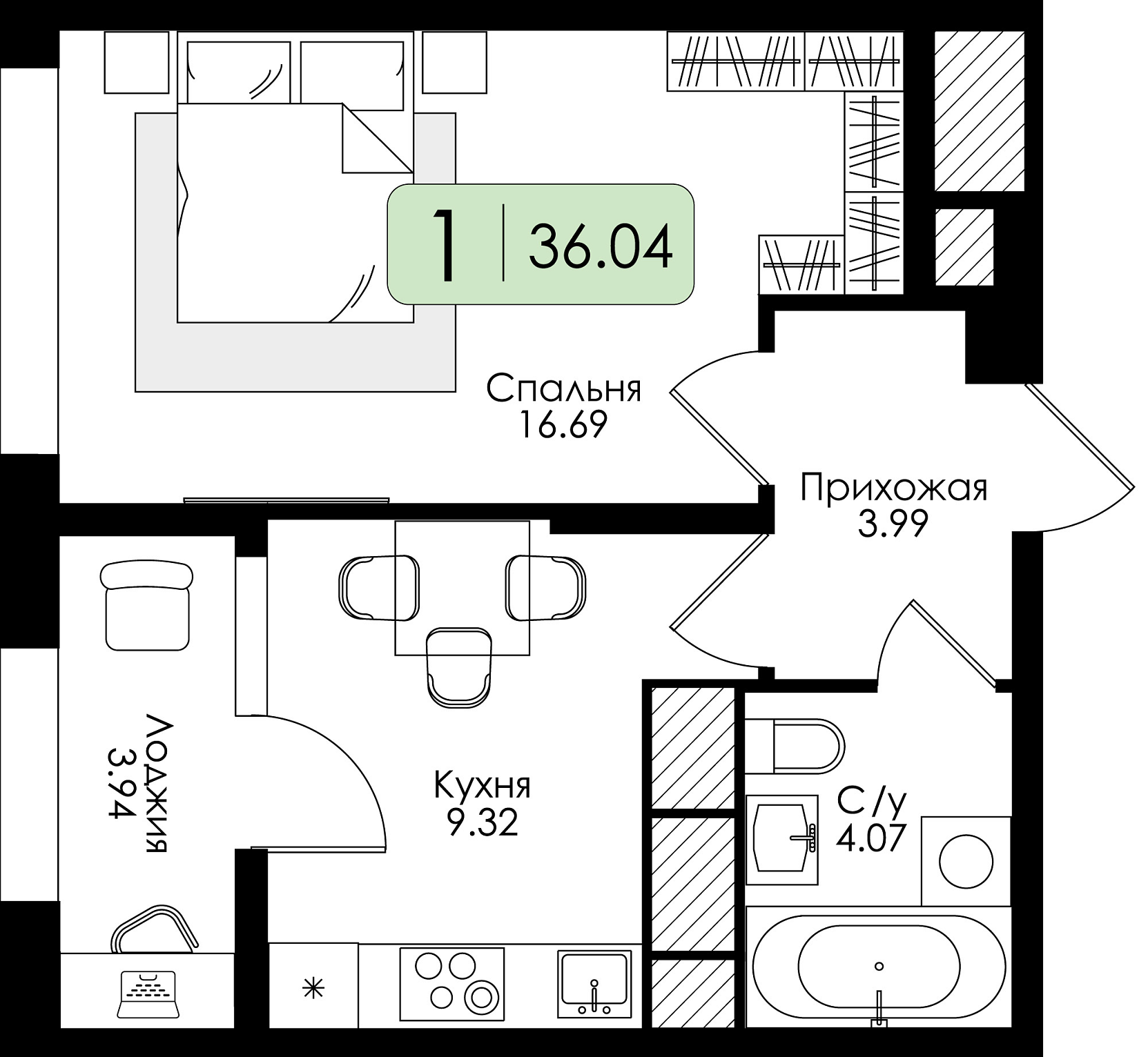 Однокомнатная квартира №212 с чистовой отделкой, Корпус № 2