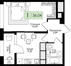 Однокомнатная квартира №224 с чистовой отделкой, Корпус № 2