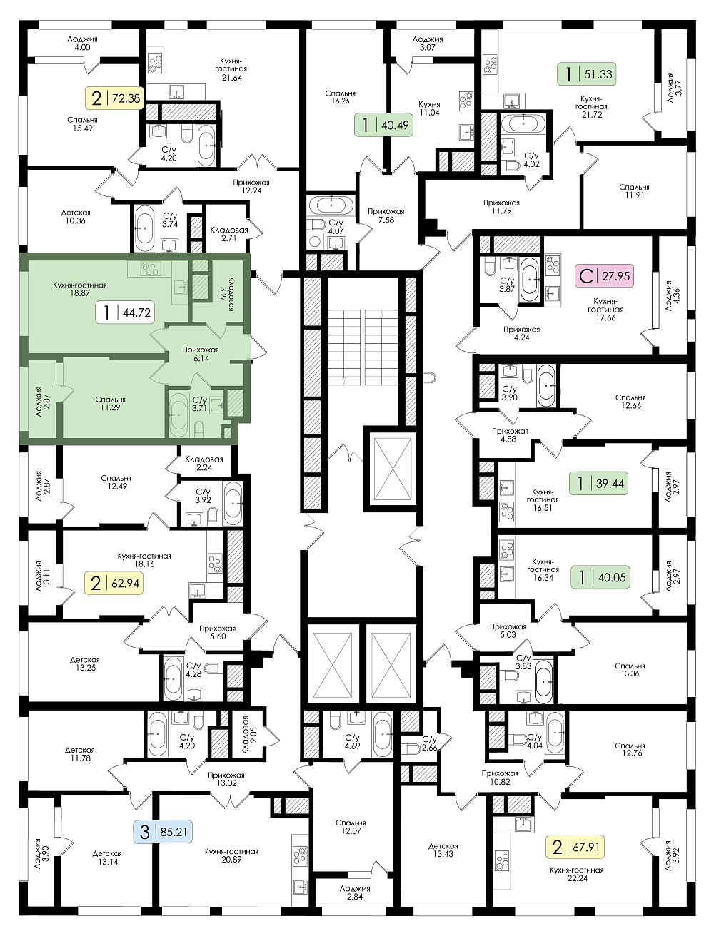 Однокомнатная квартира №99 с предчистовой отделкой, Корпус 1, Секция 1