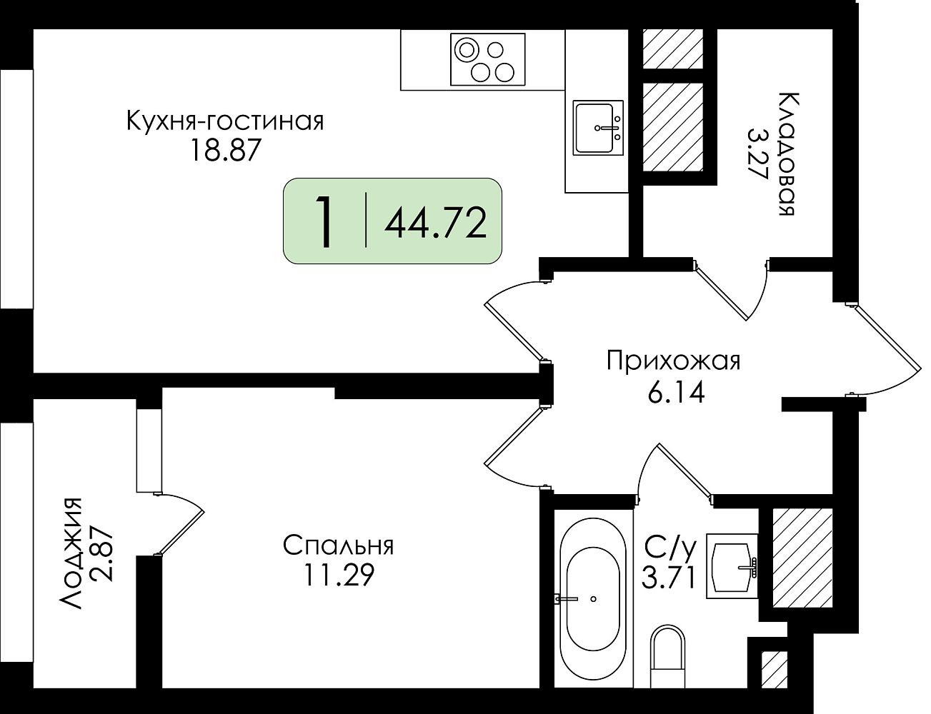 Однокомнатная квартира №119 с чистовой отделкой, Корпус 1, Секция 1
