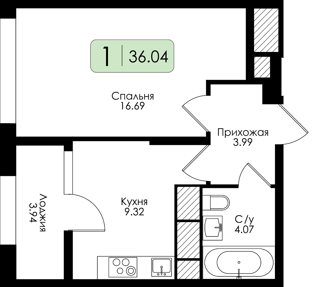 Однокомнатная квартира №56 с чистовой отделкой, Корпус 2, Секция 1