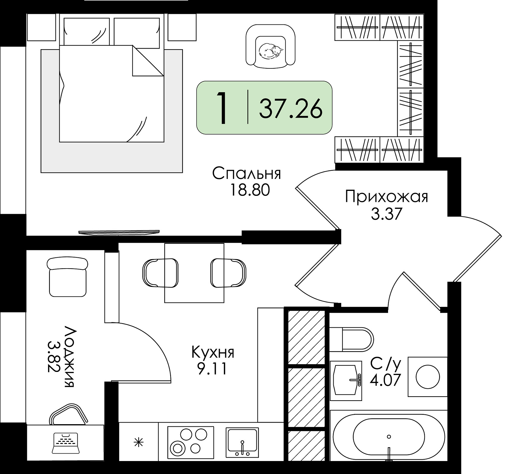 Однокомнатная квартира №102 с чистовой отделкой, Корпус 2, Секция 1