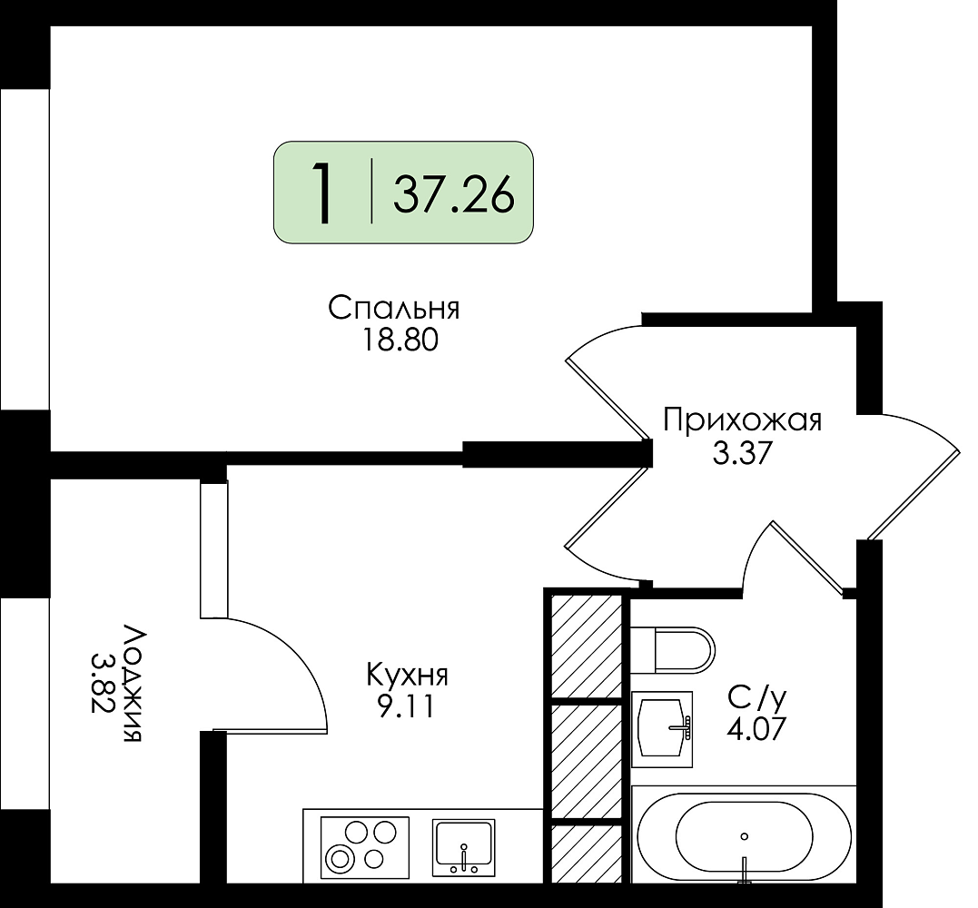 Однокомнатная квартира №186 с чистовой отделкой, Корпус 2, Секция 1