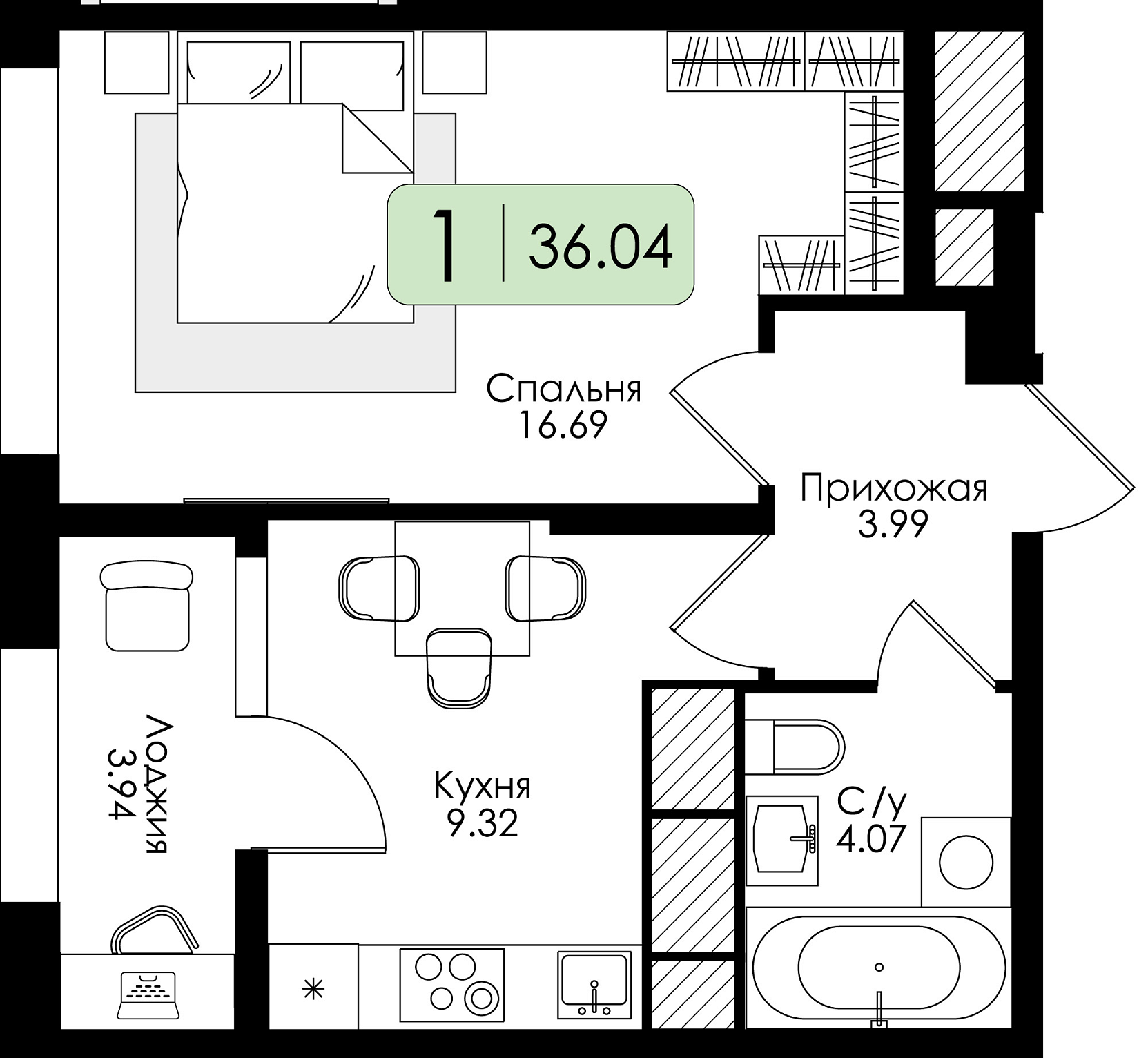 Однокомнатная квартира №200 с чистовой отделкой, Корпус 2, Секция 1