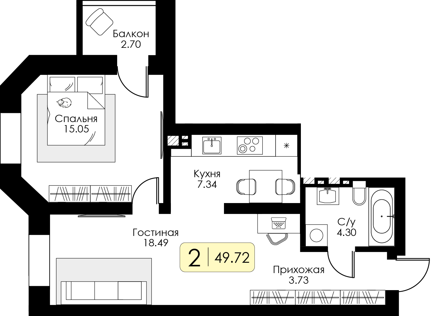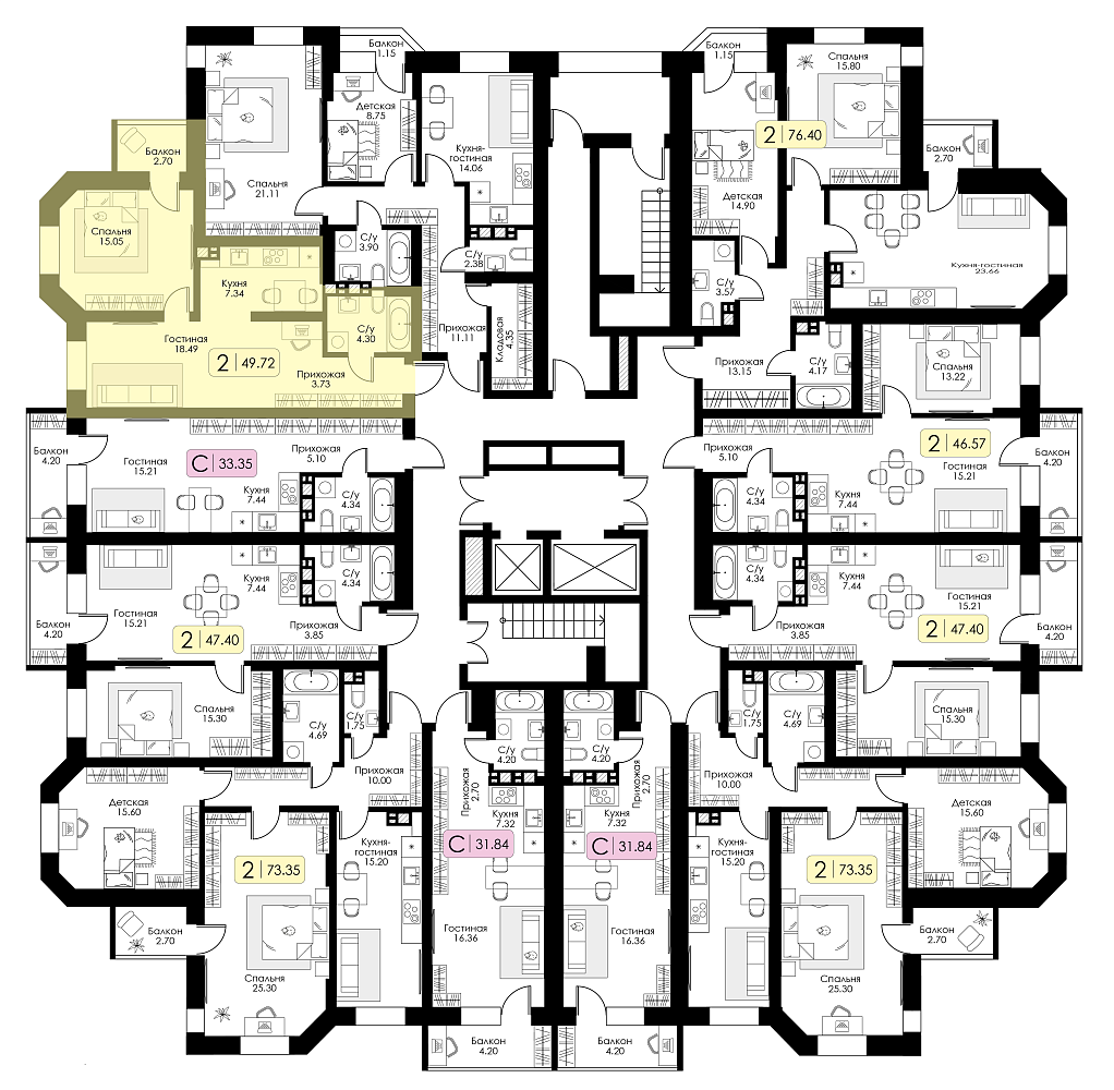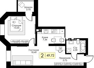 Двухкомнатная квартира №164, Корпус №11, Секция 1