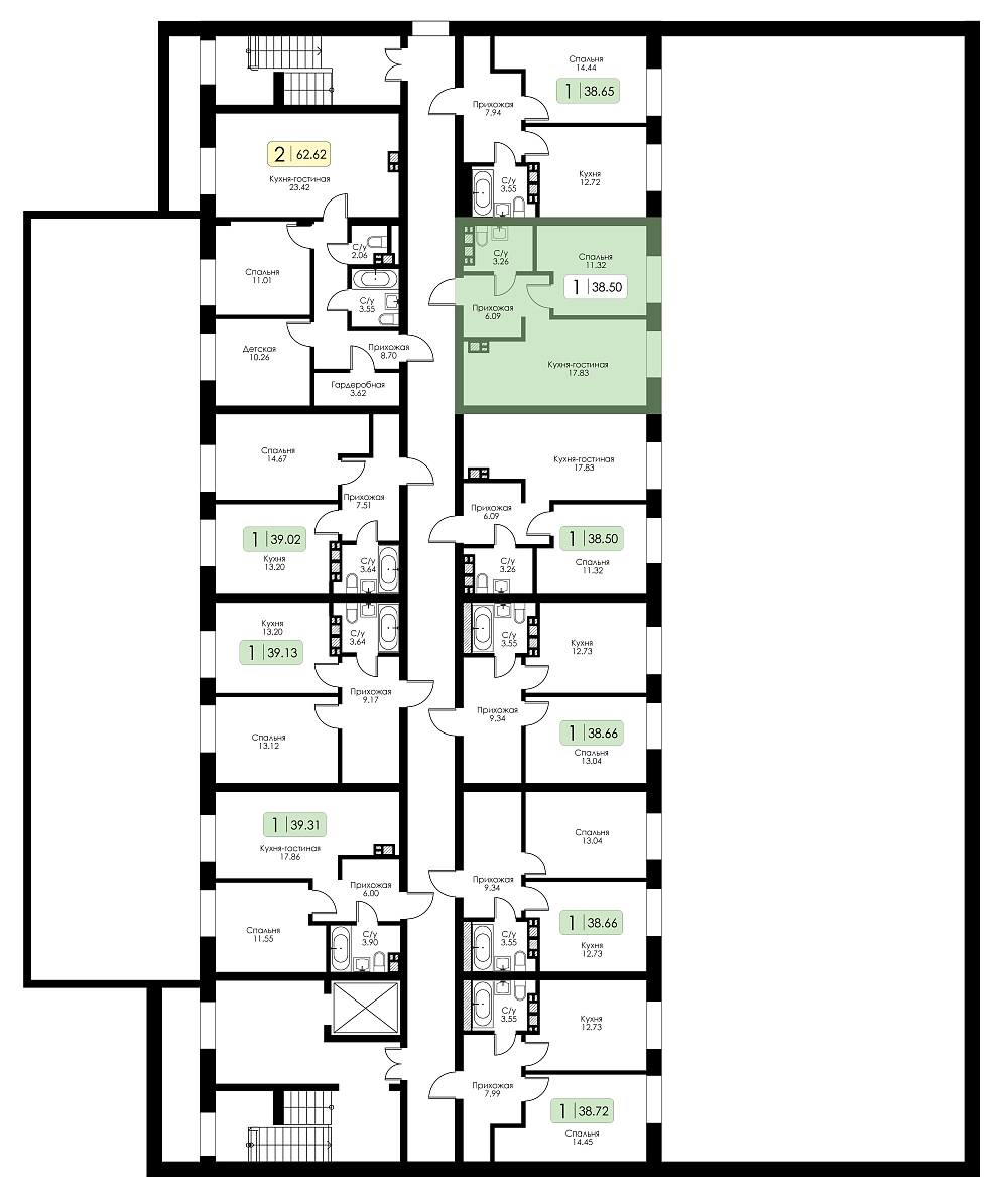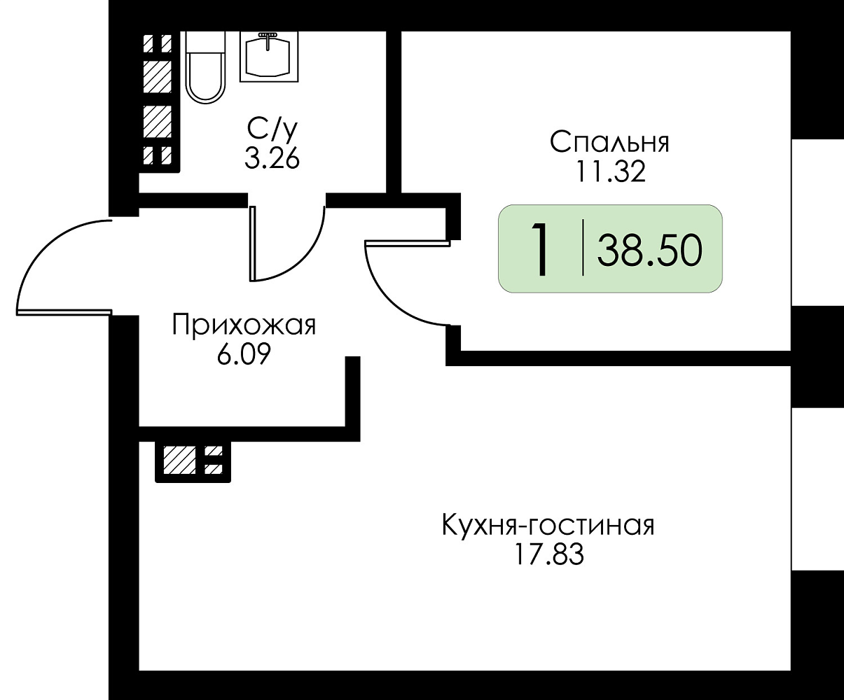 Однокомнатная квартира №2, Корпус №3, Секция 1