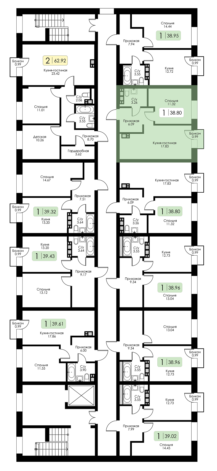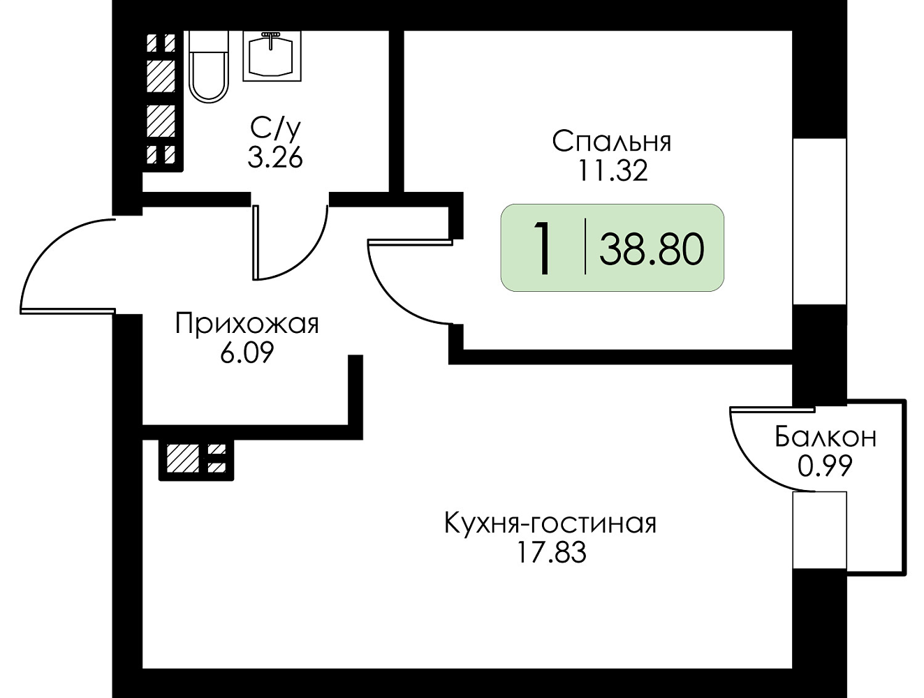 Однокомнатная квартира №22, Корпус №3, Секция 1