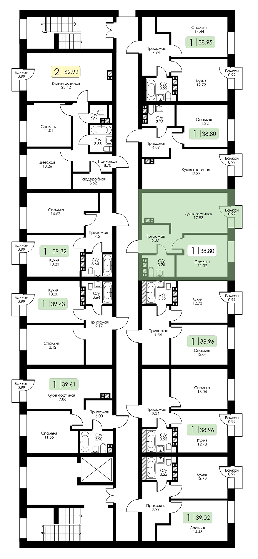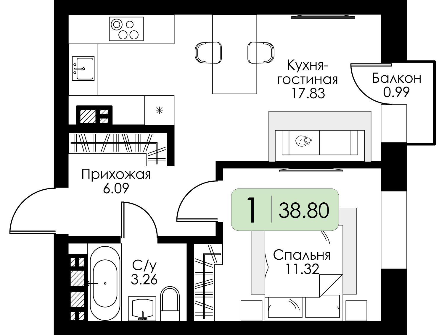 Однокомнатная квартира №23, Корпус №3, Секция 1