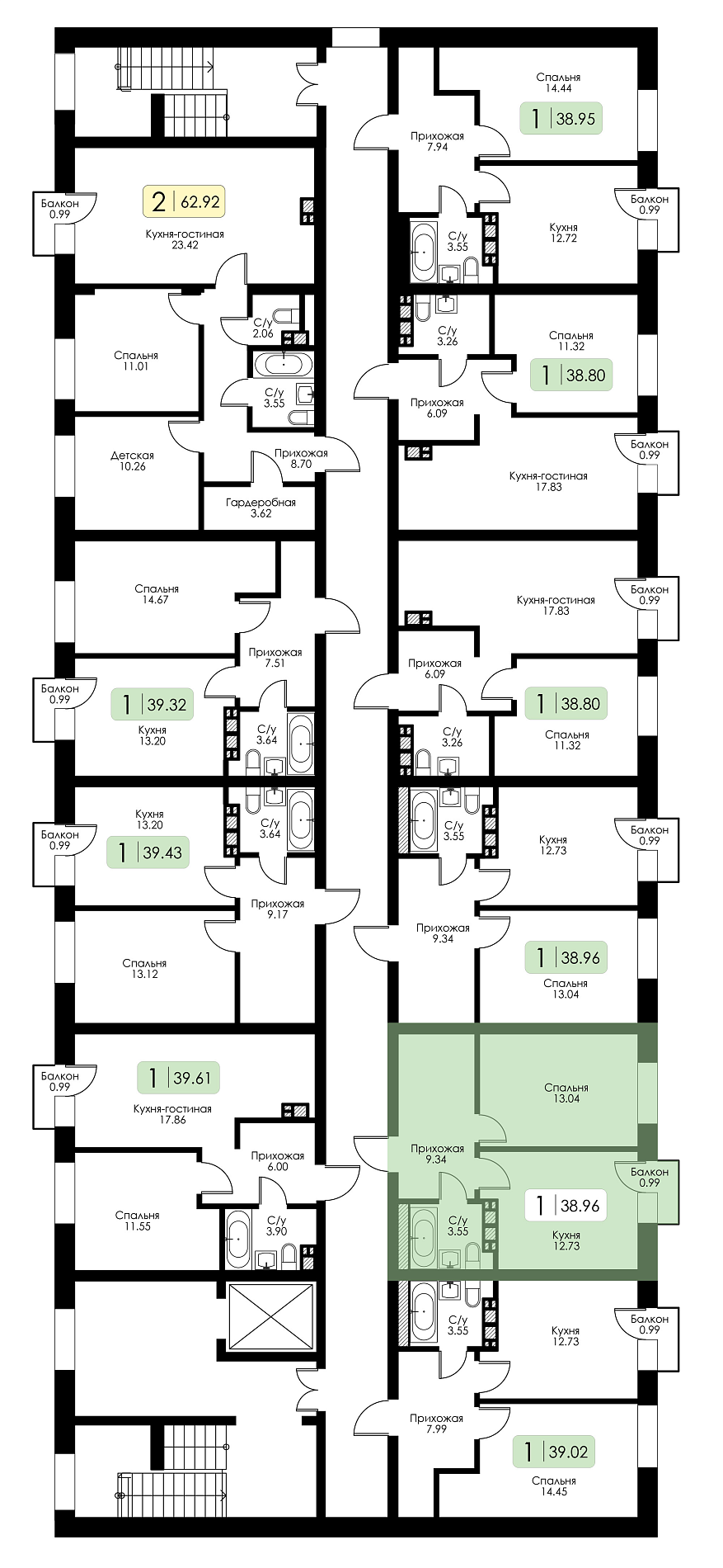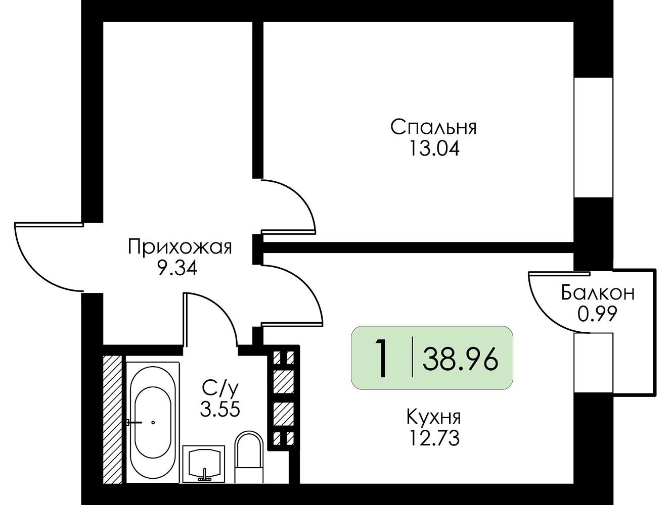 Однокомнатная квартира №25, Корпус №3, Секция 1