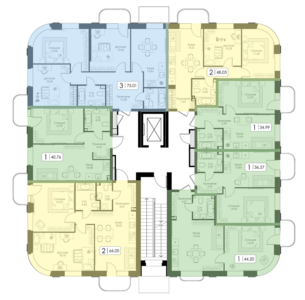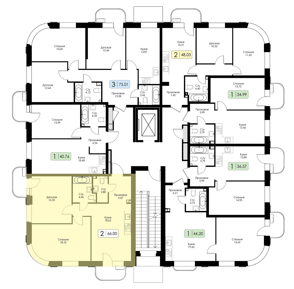 Двухкомнатная квартира №12 с предчистовой отделкой, Корпус № 1.1, Секция 1