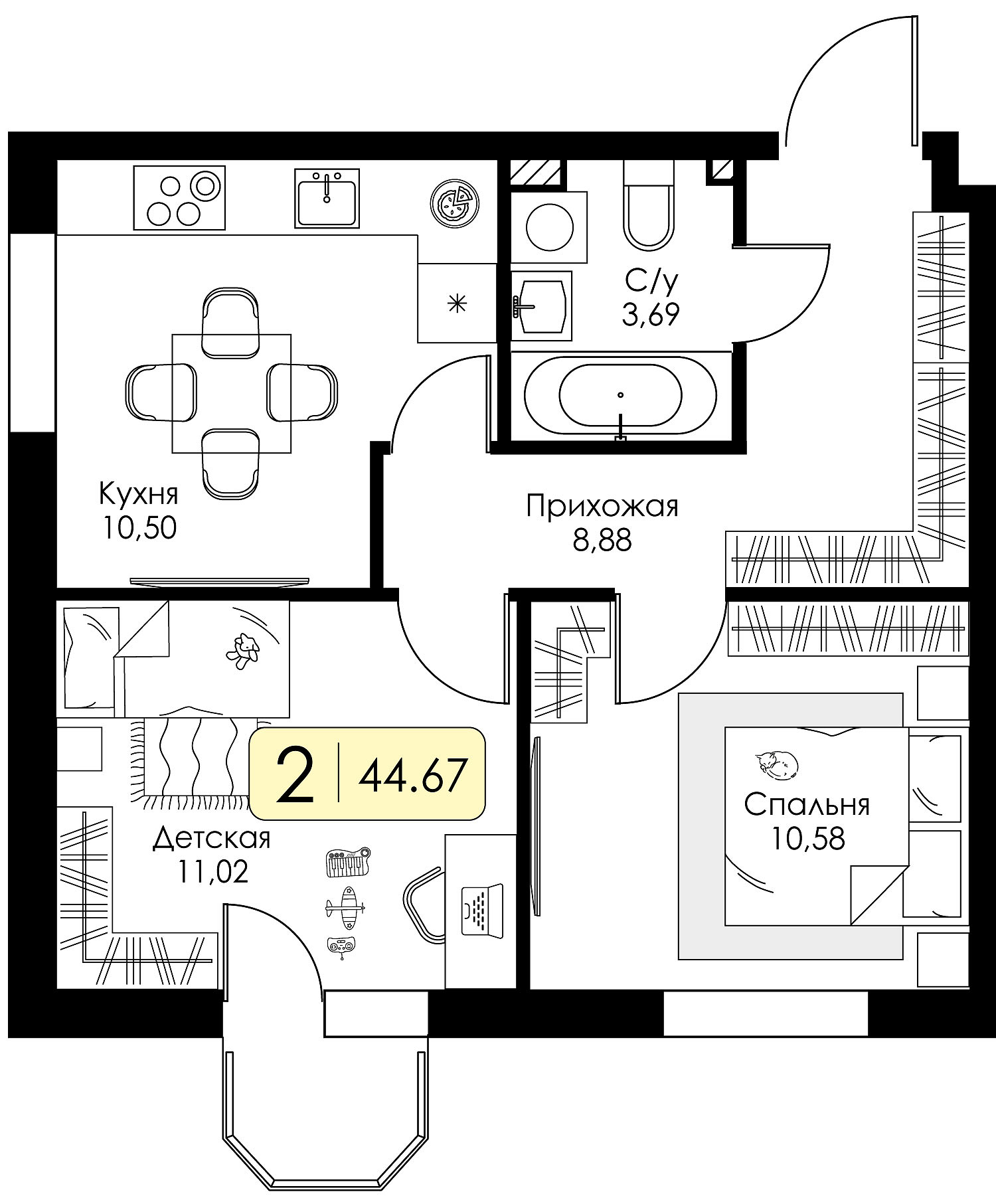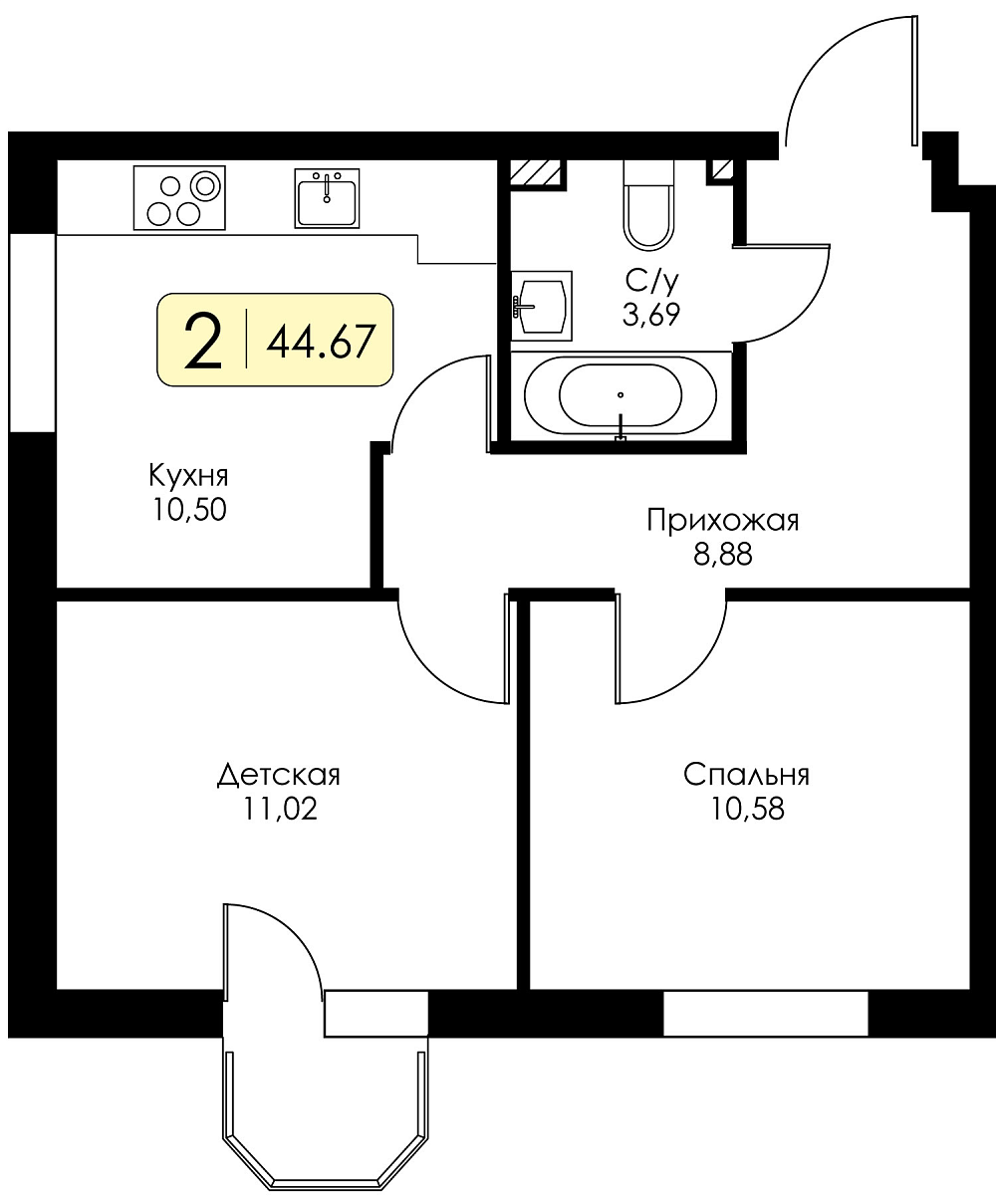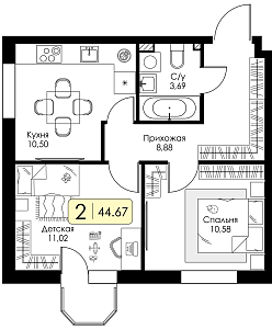 Двухкомнатная квартира №49 с предчистовой отделкой, Корпус № 1.1, Секция 2