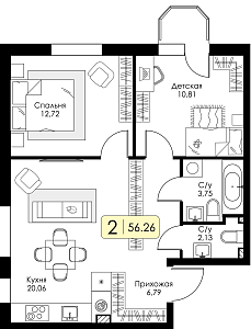 Двухкомнатная квартира №50 с предчистовой отделкой, Корпус № 1.1, Секция 2