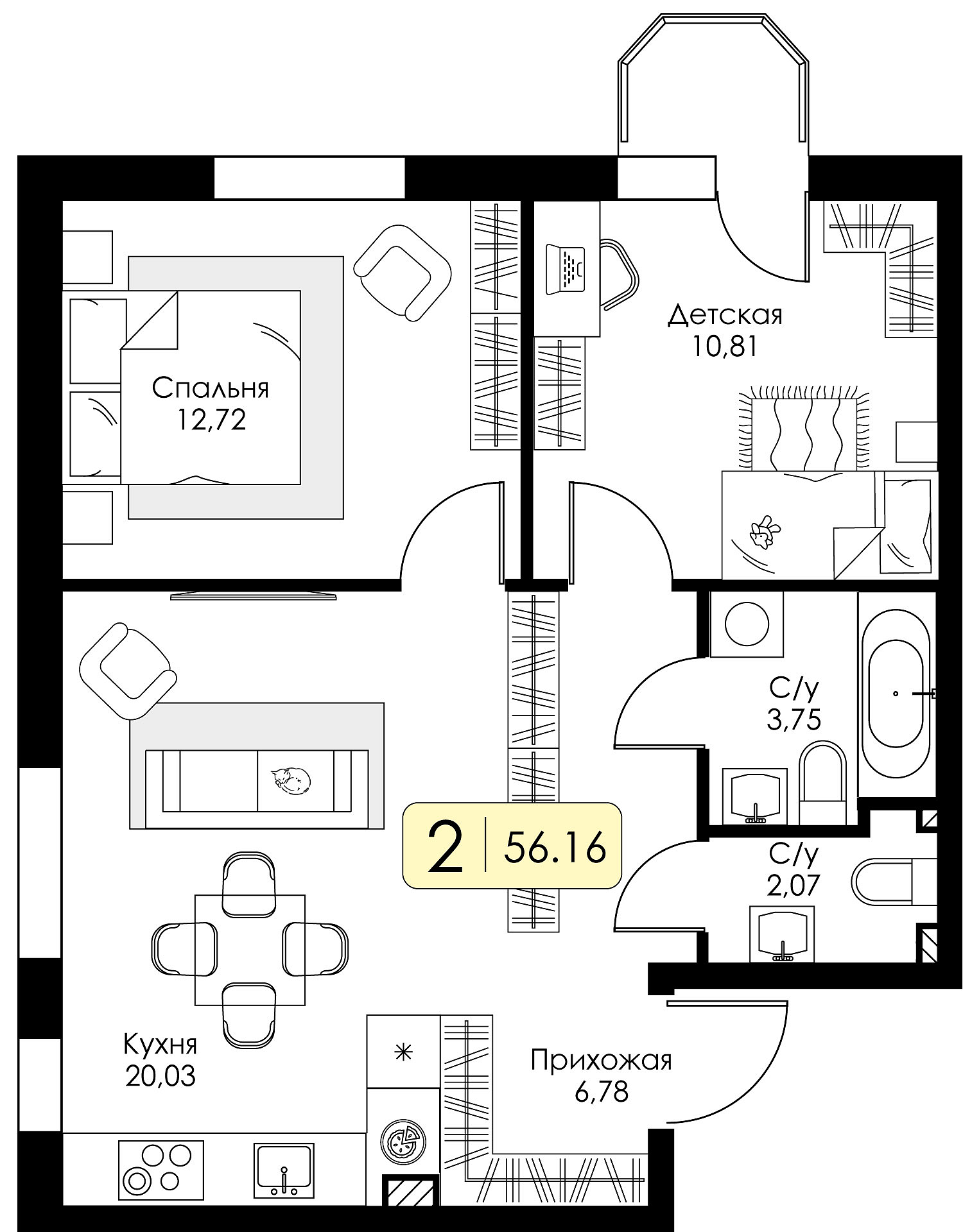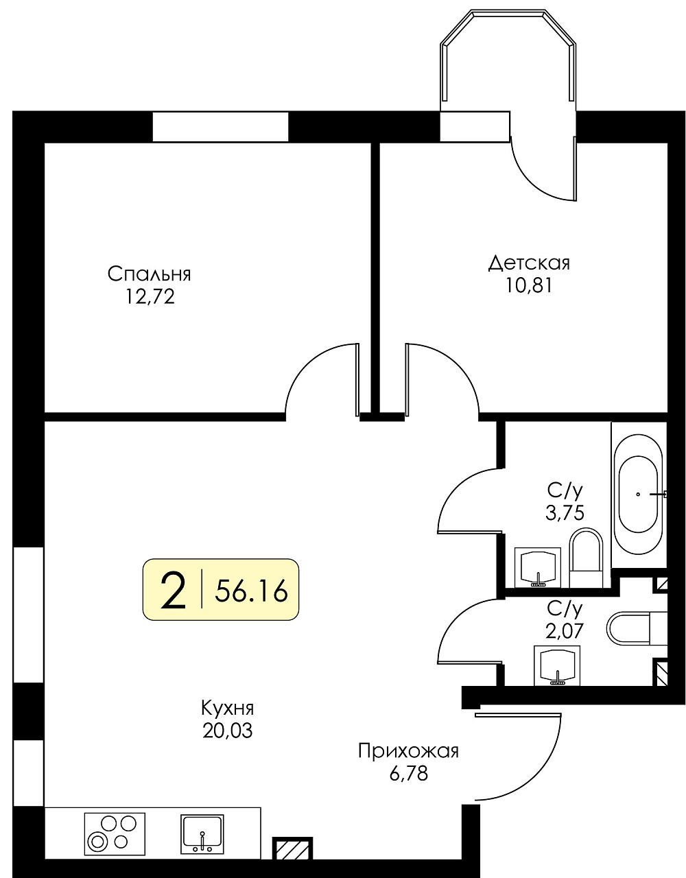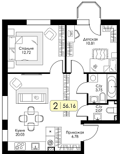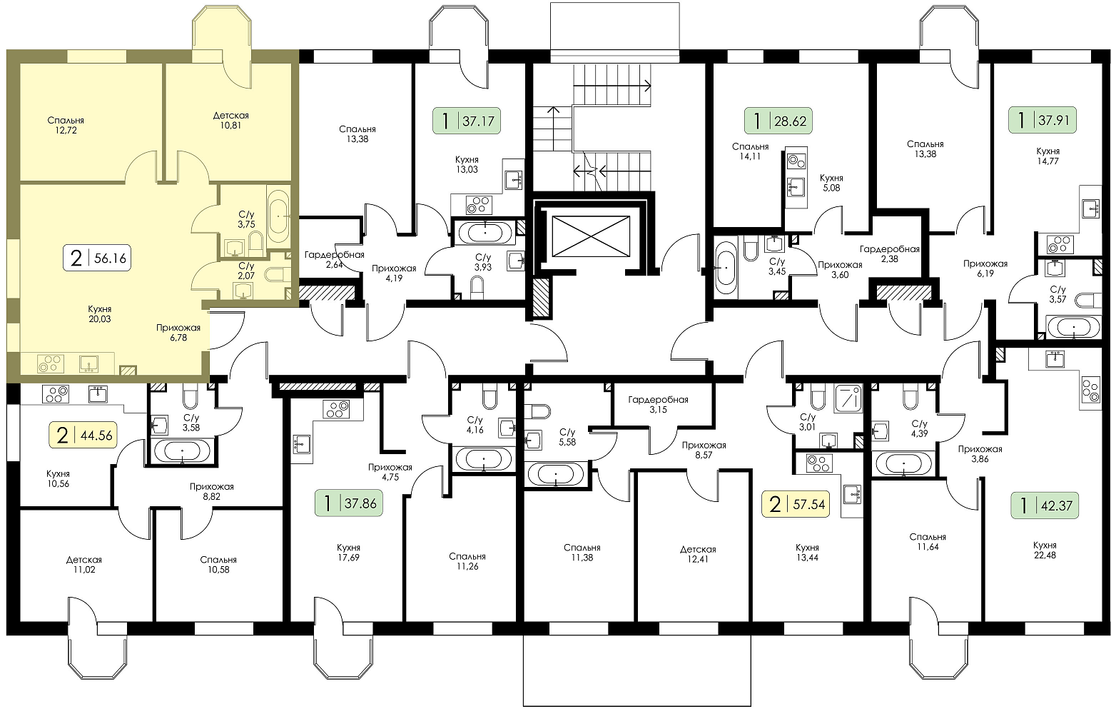 Двухкомнатная квартира №58 с предчистовой отделкой, Корпус № 1.1, Секция 2