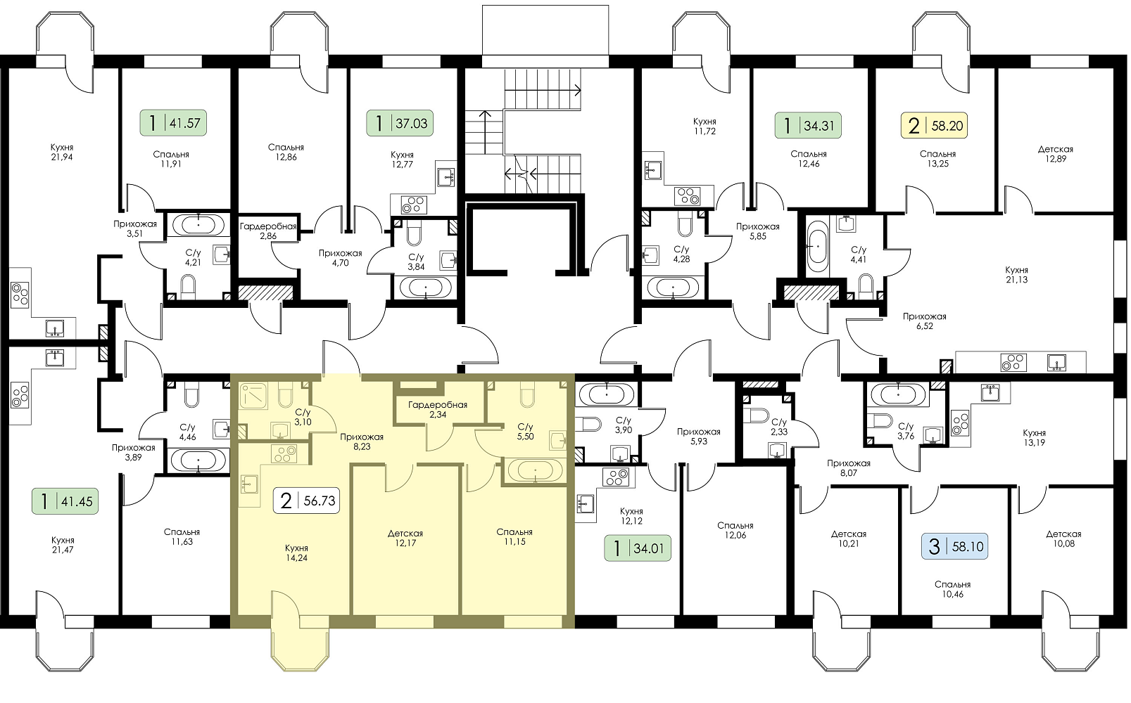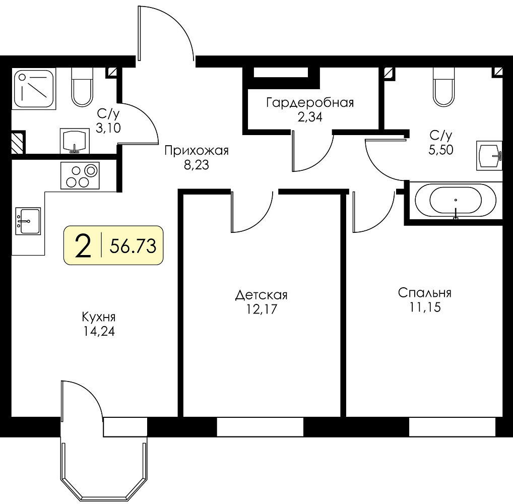 Двухкомнатная квартира №71 с предчистовой отделкой, Корпус № 1.1, Секция 3