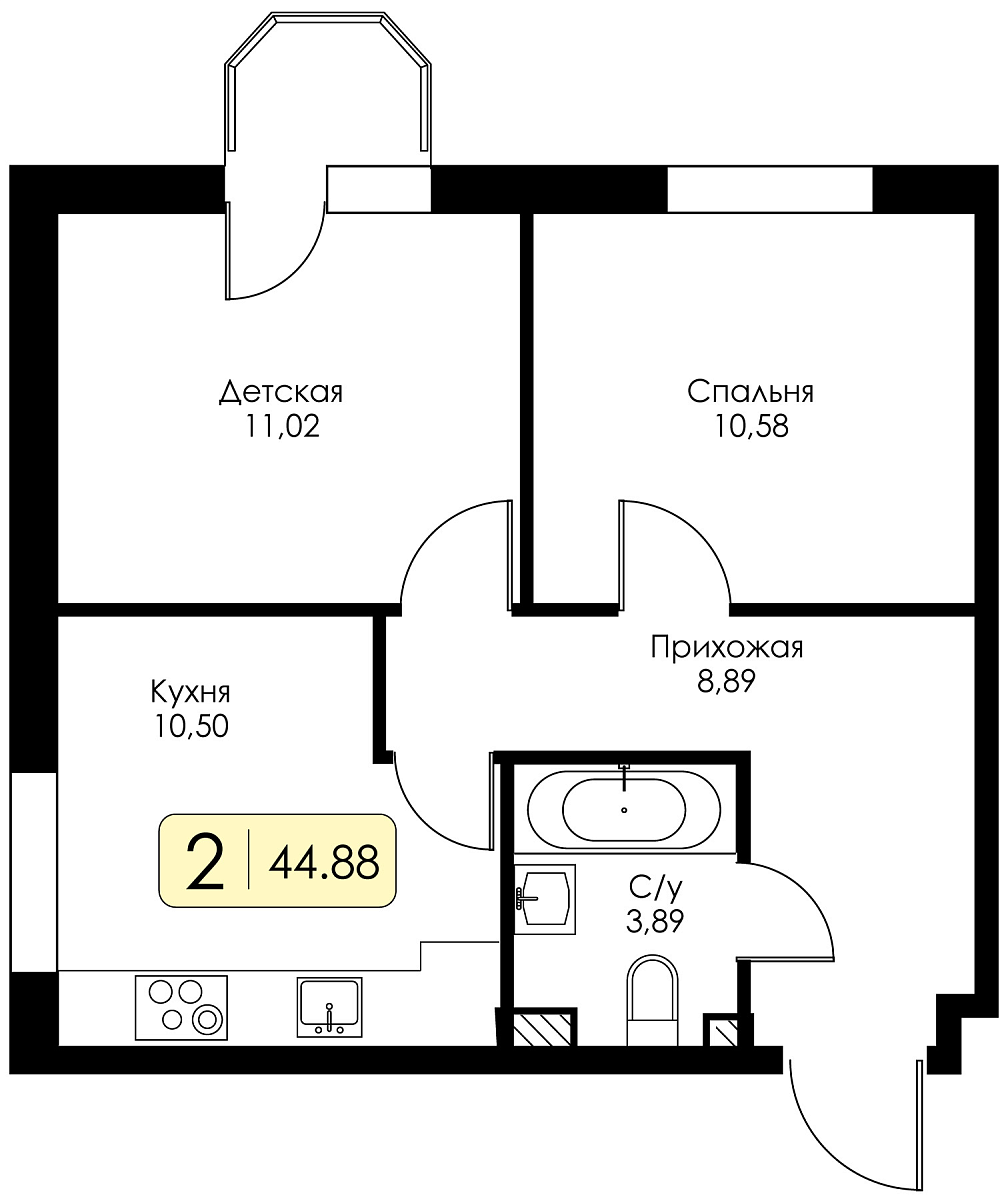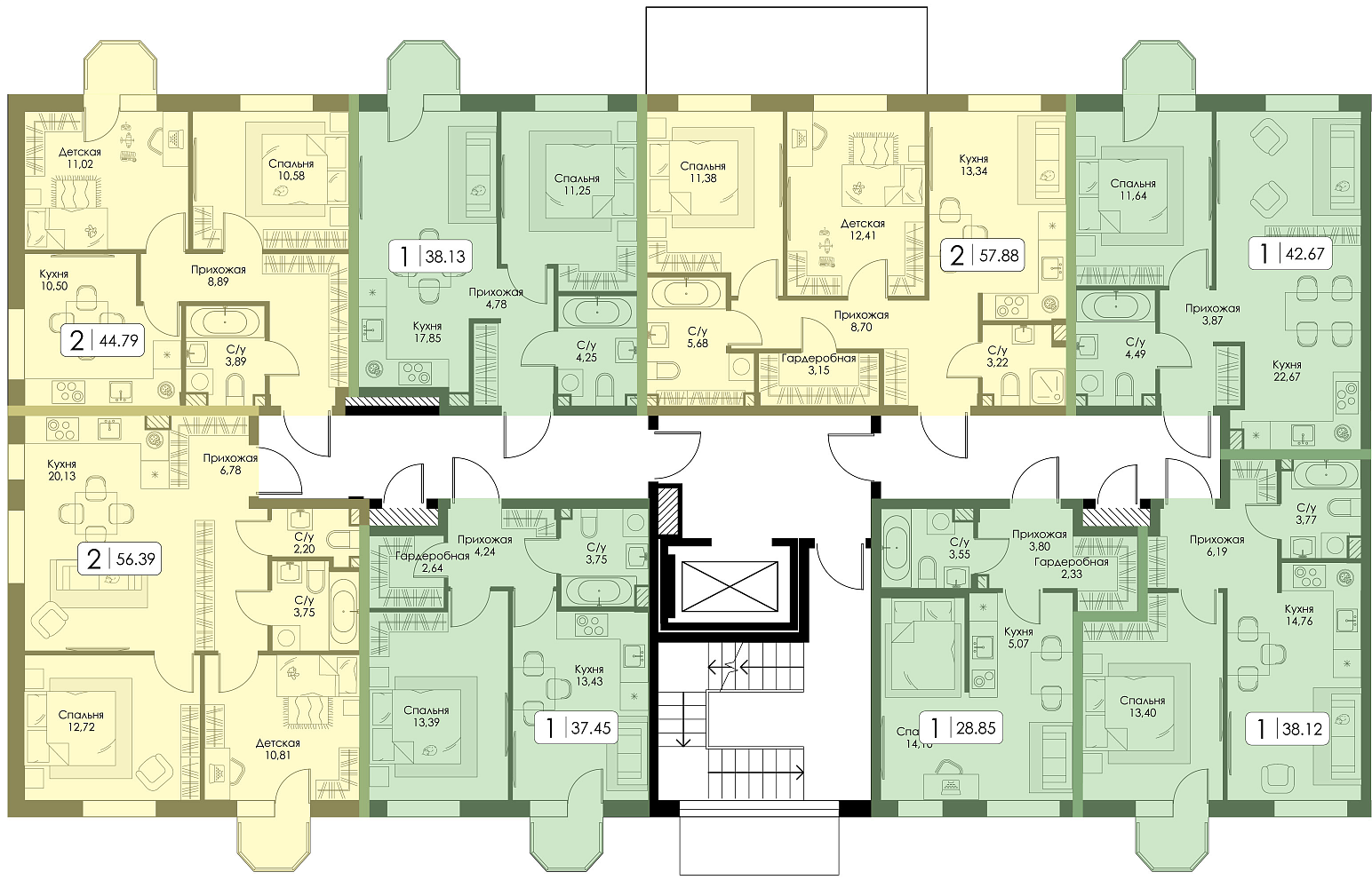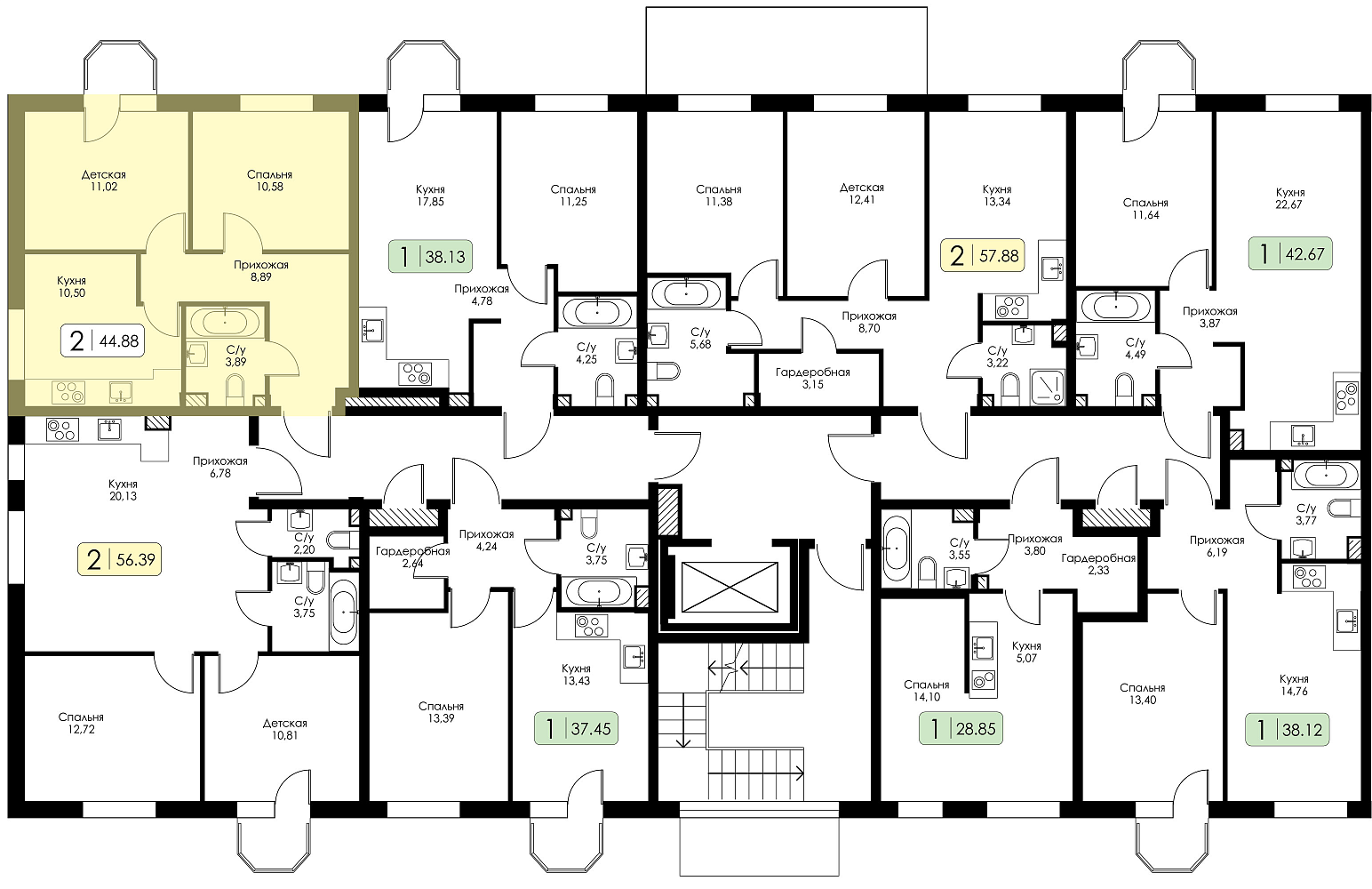 Двухкомнатная квартира №128 с предчистовой отделкой, Корпус № 1.1, Секция 5