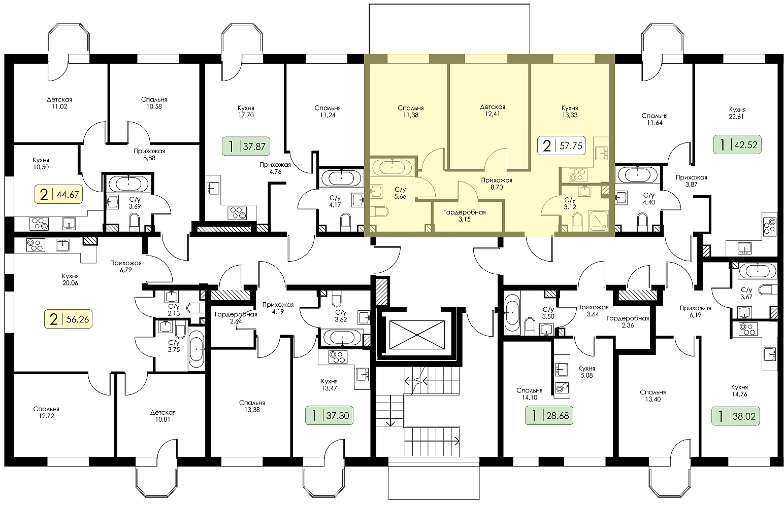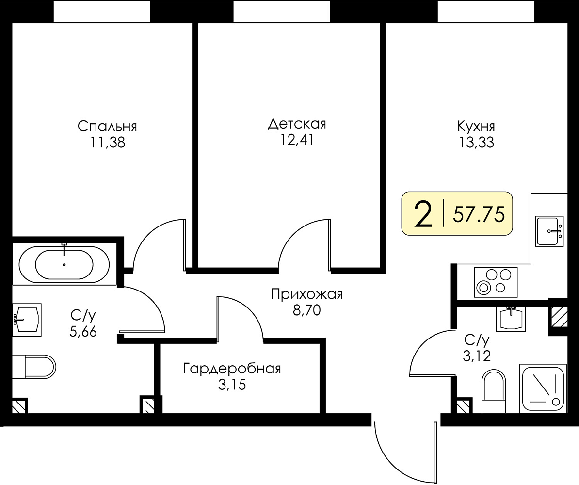 Двухкомнатная квартира №138 с предчистовой отделкой, Корпус № 1.1, Секция 5