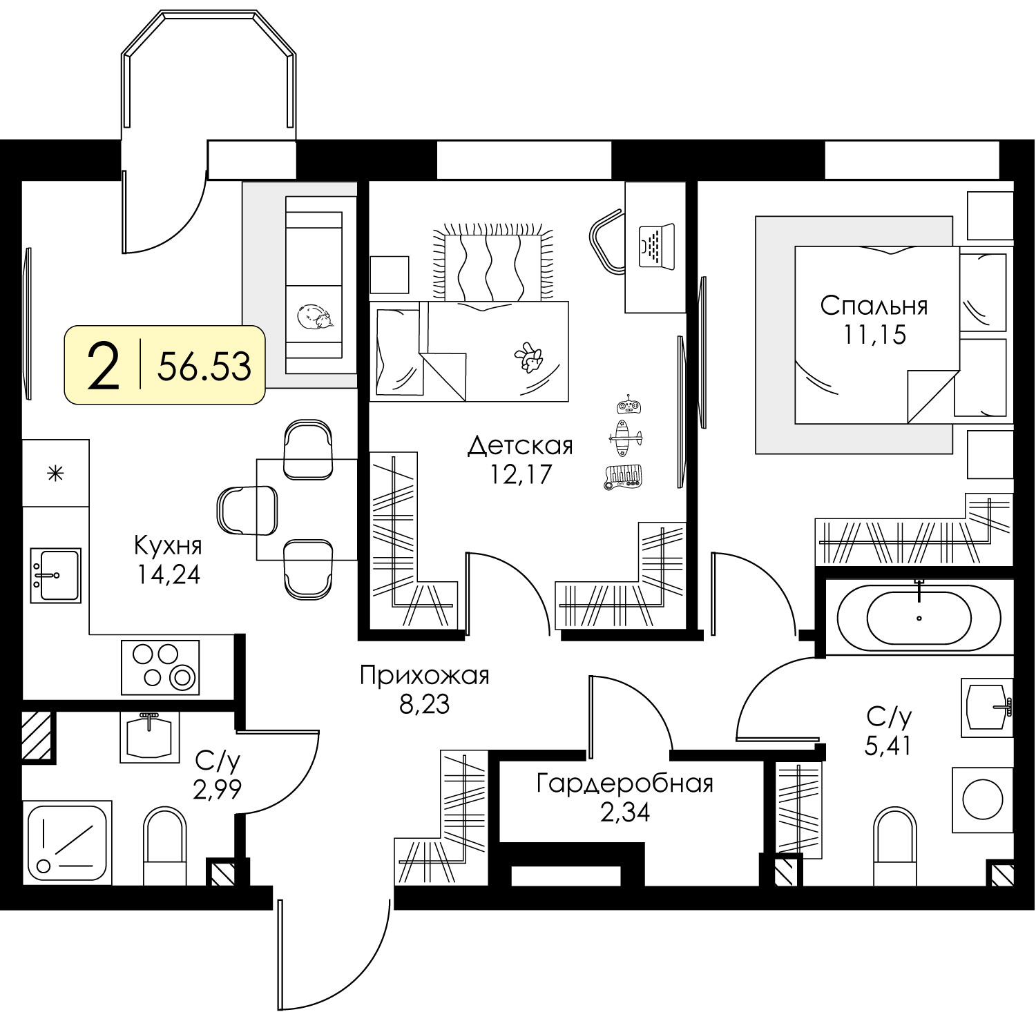 Двухкомнатная квартира №168 с предчистовой отделкой, Корпус № 1.1, Секция 6