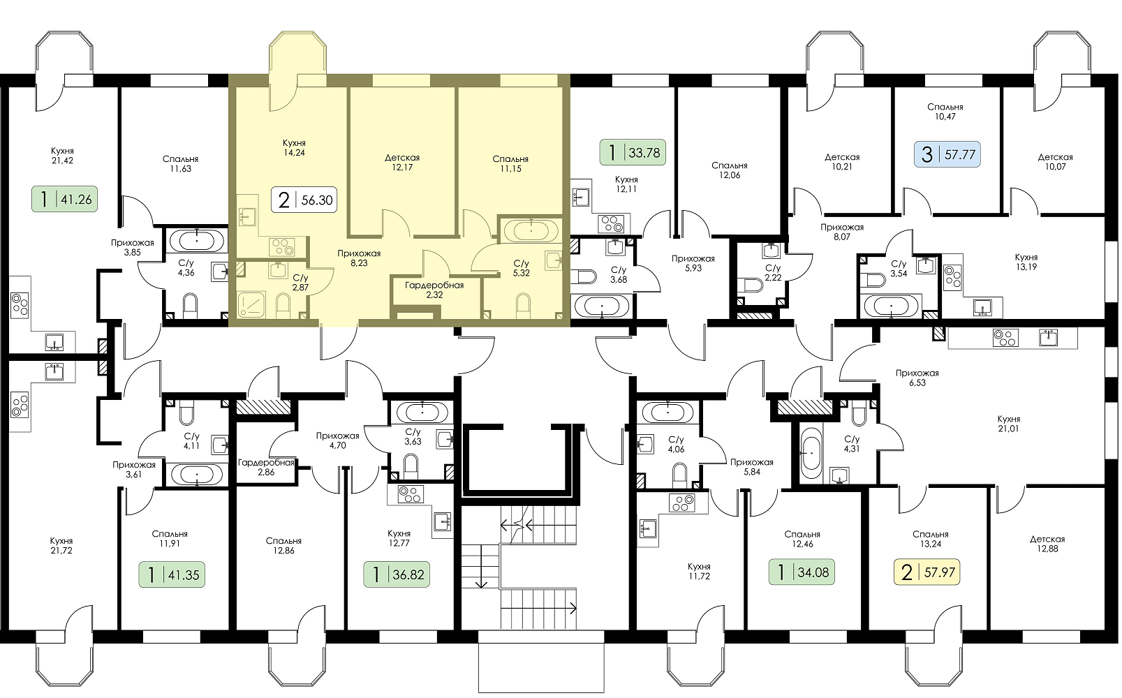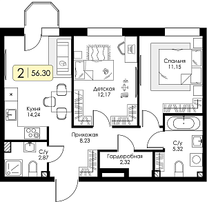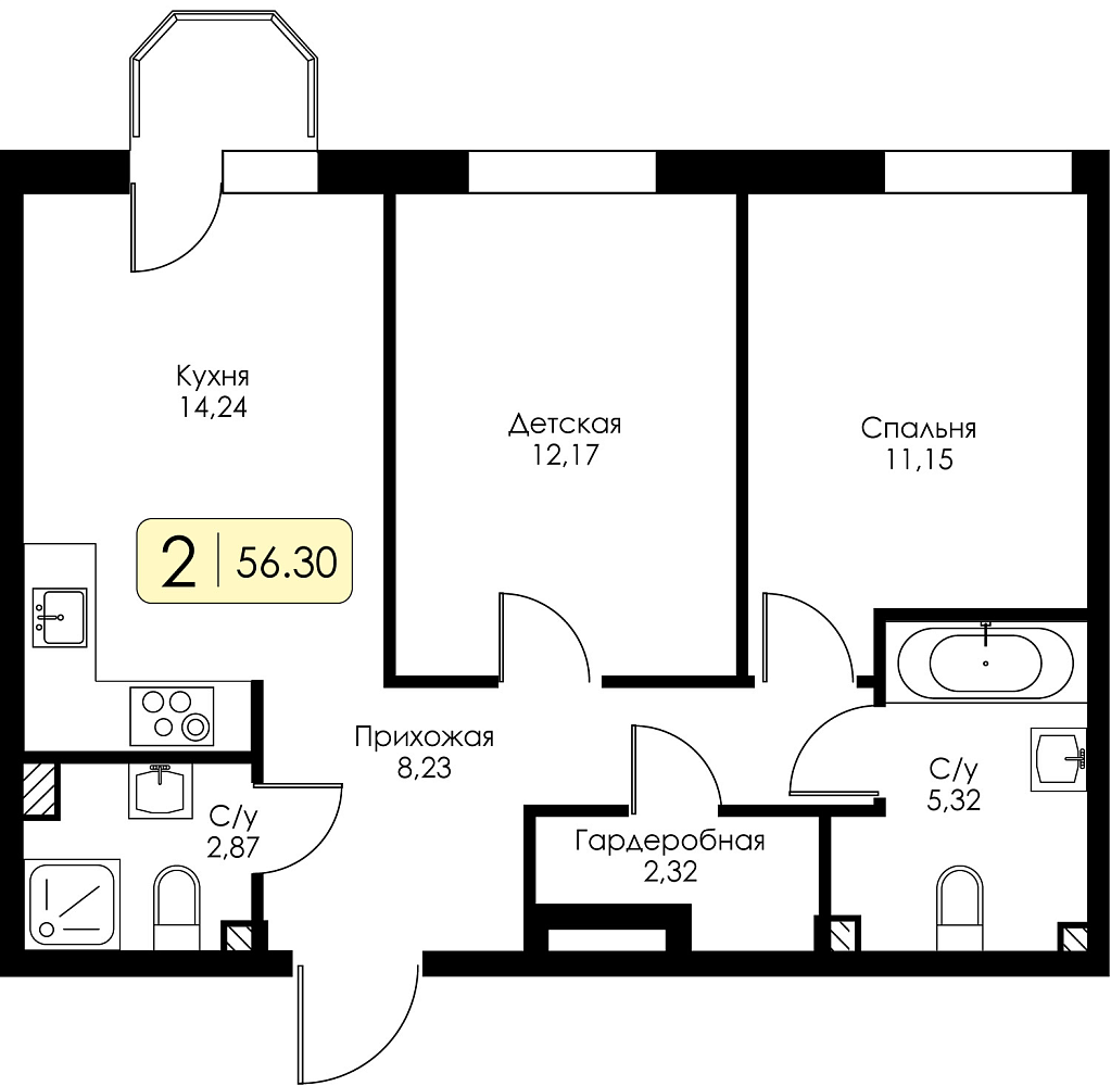 Двухкомнатная квартира №176 с предчистовой отделкой, Корпус № 1.1, Секция 6