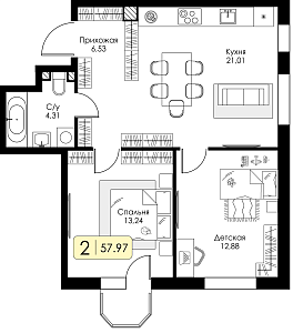 Двухкомнатная квартира №179 с предчистовой отделкой, Корпус № 1.1, Секция 6