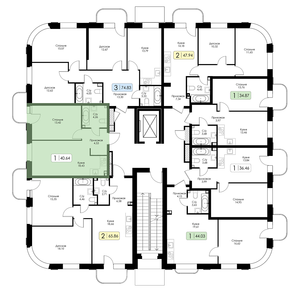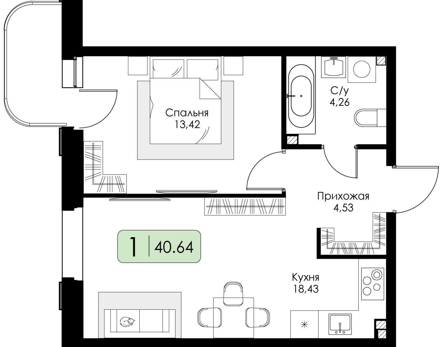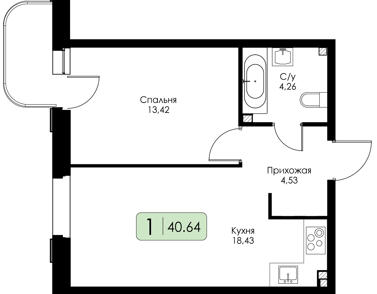 Однокомнатная квартира №20 с предчистовой отделкой, Корпус № 1.1, Секция 1