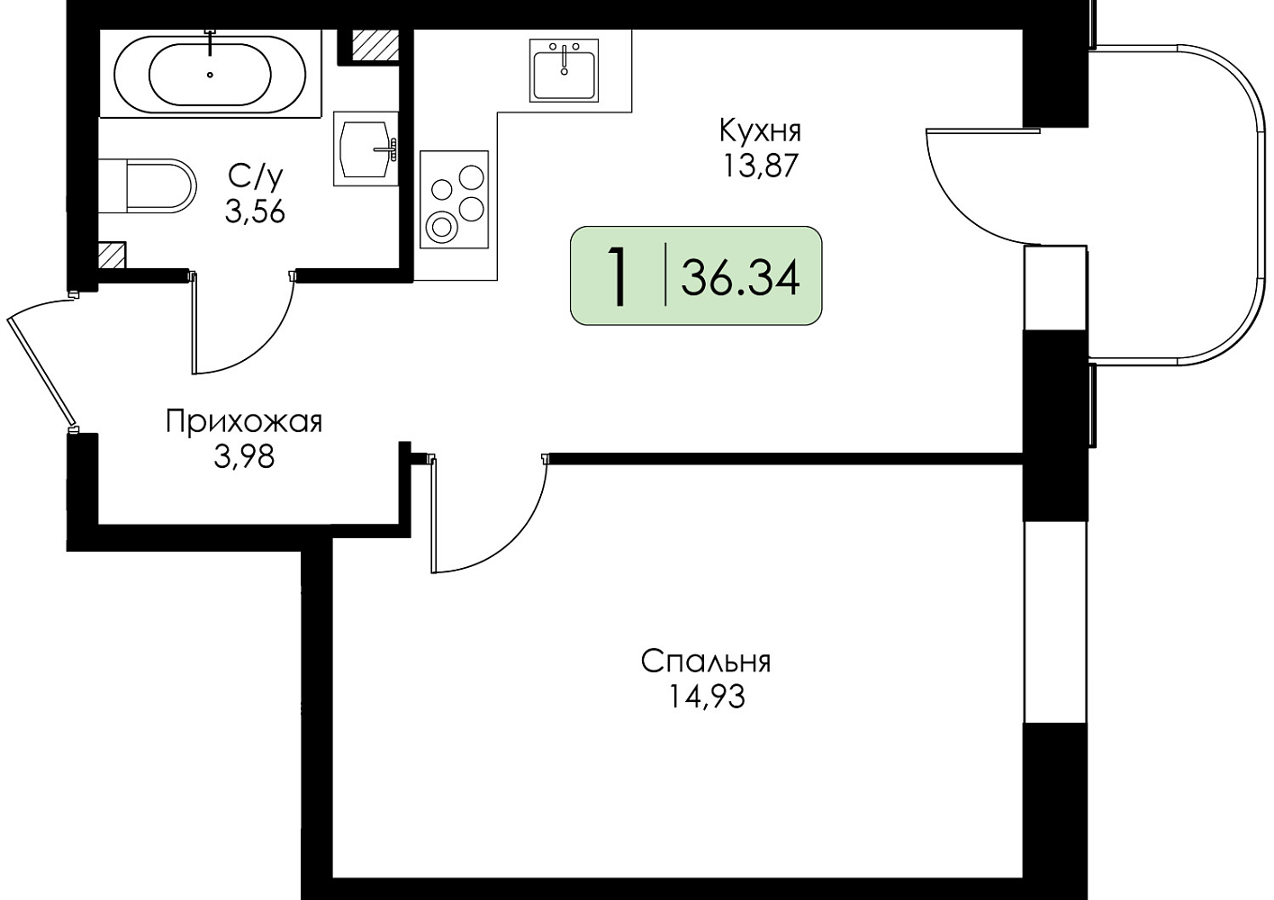 Однокомнатная квартира №24 с предчистовой отделкой, Корпус № 1.1, Секция 1