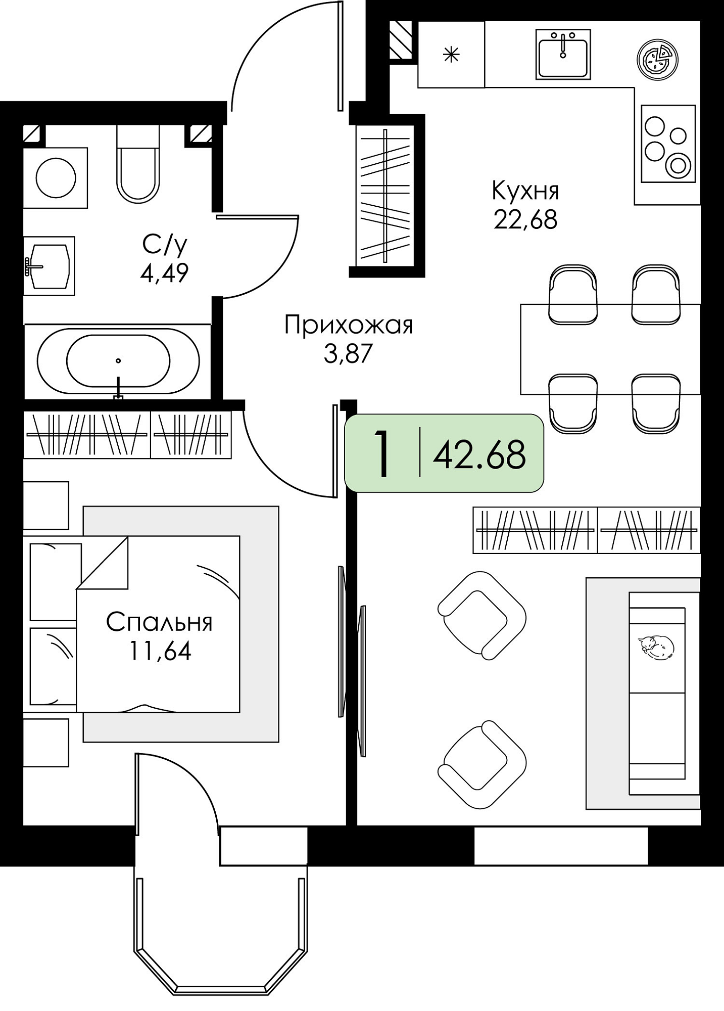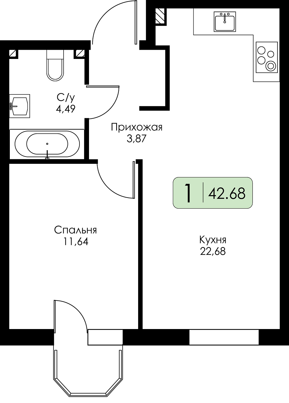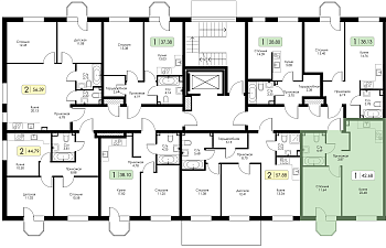 Однокомнатная квартира №38 с предчистовой отделкой, Корпус № 1.1, Секция 2