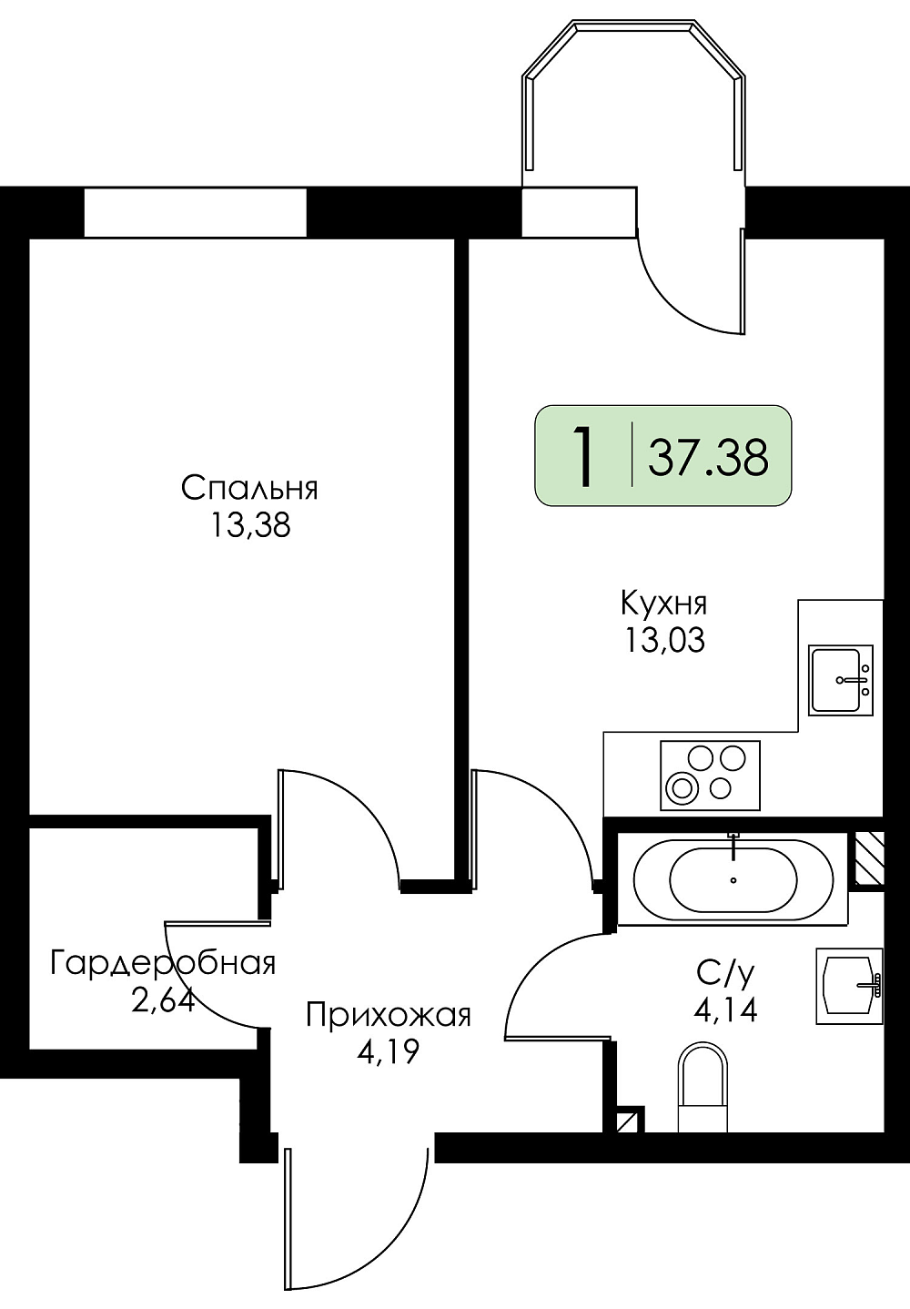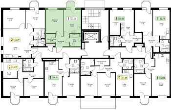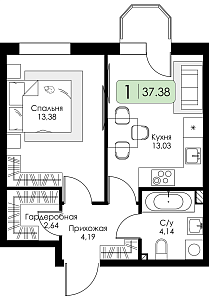Однокомнатная квартира №43 с предчистовой отделкой, Корпус № 1.1, Секция 2