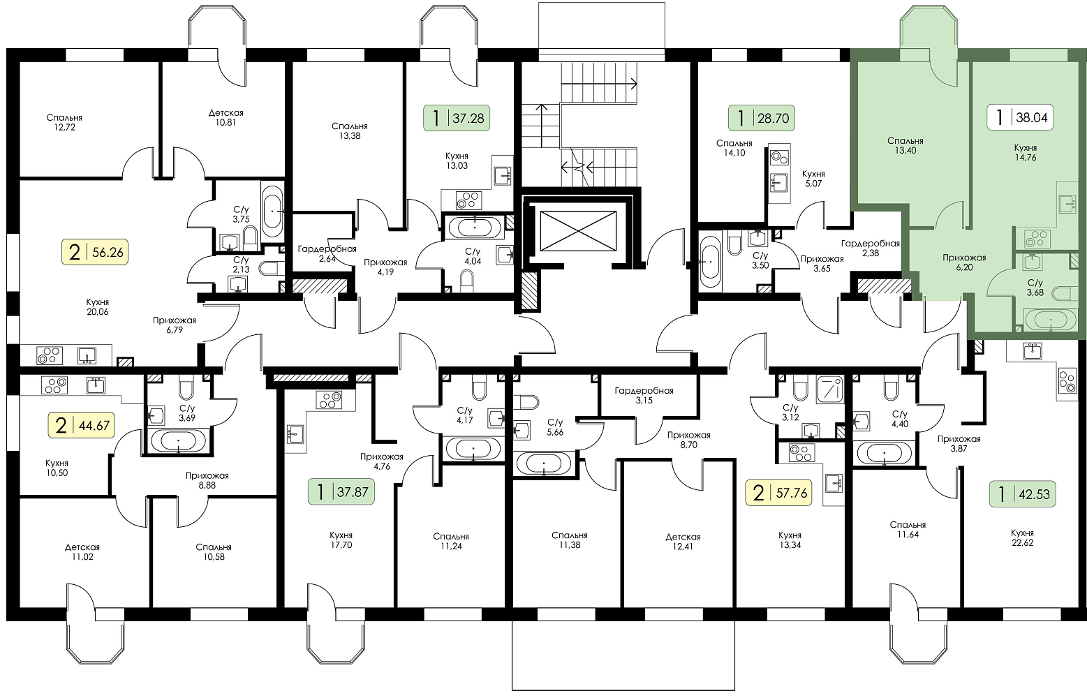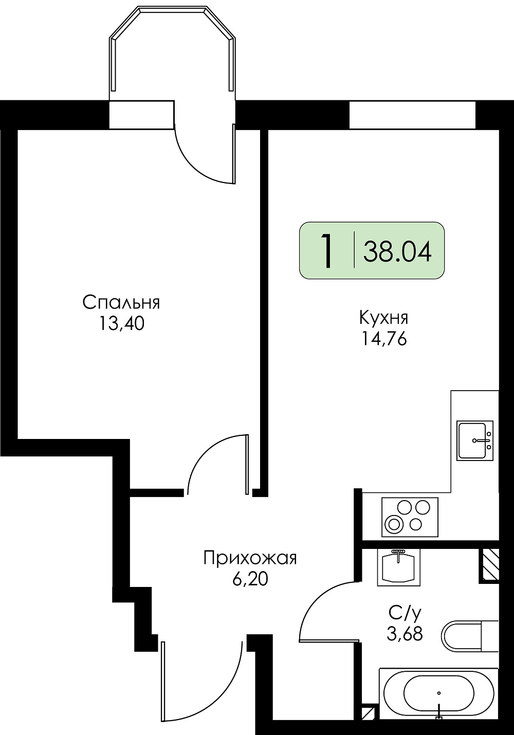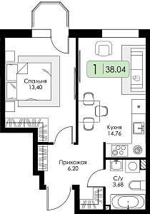 Однокомнатная квартира №45 с предчистовой отделкой, Корпус № 1.1, Секция 2