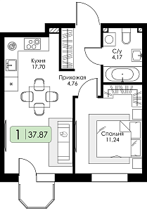 Однокомнатная квартира №48 с предчистовой отделкой, Корпус № 1.1, Секция 2