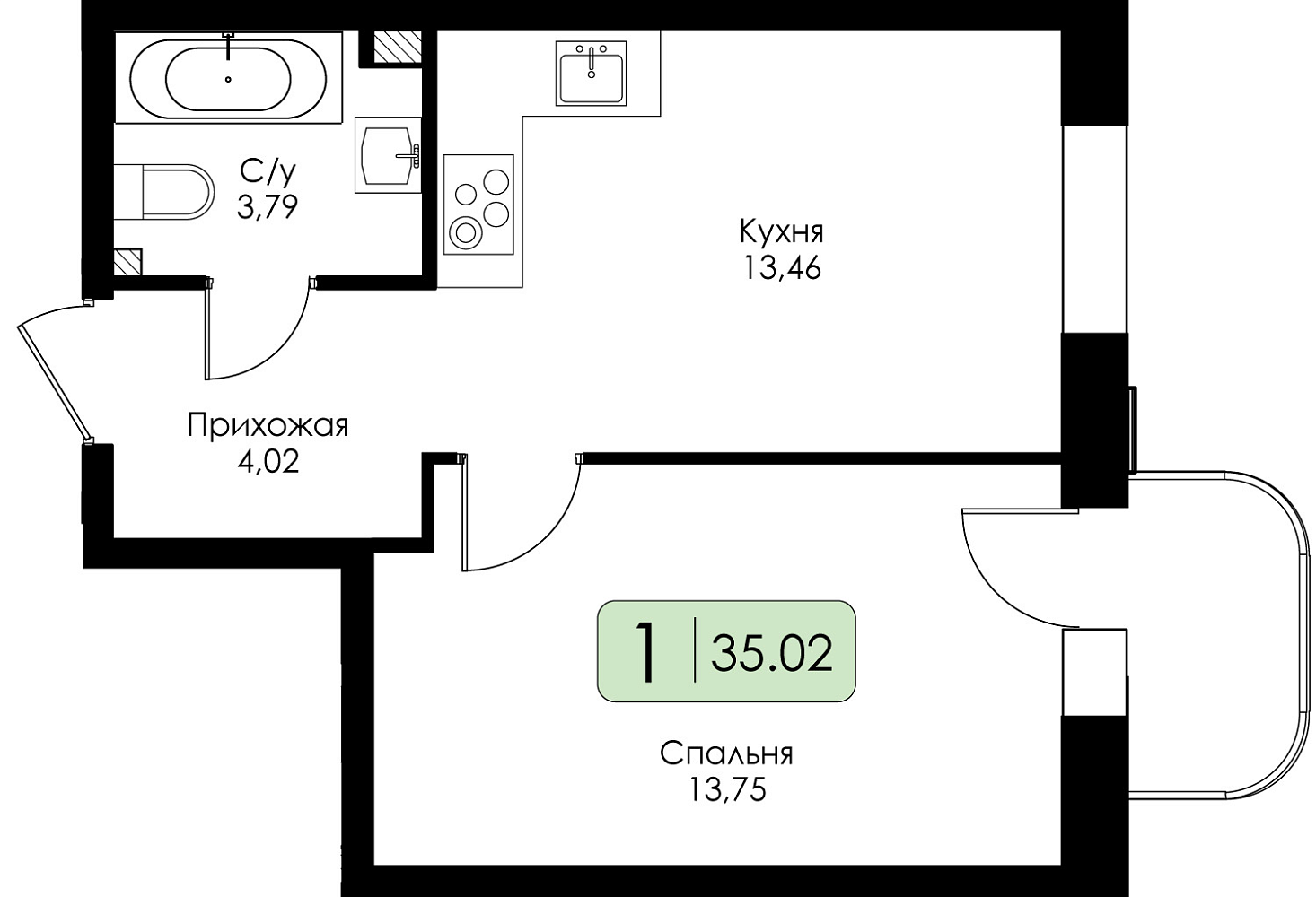 Однокомнатная квартира №103 с предчистовой отделкой, Корпус № 1.1, Секция 4