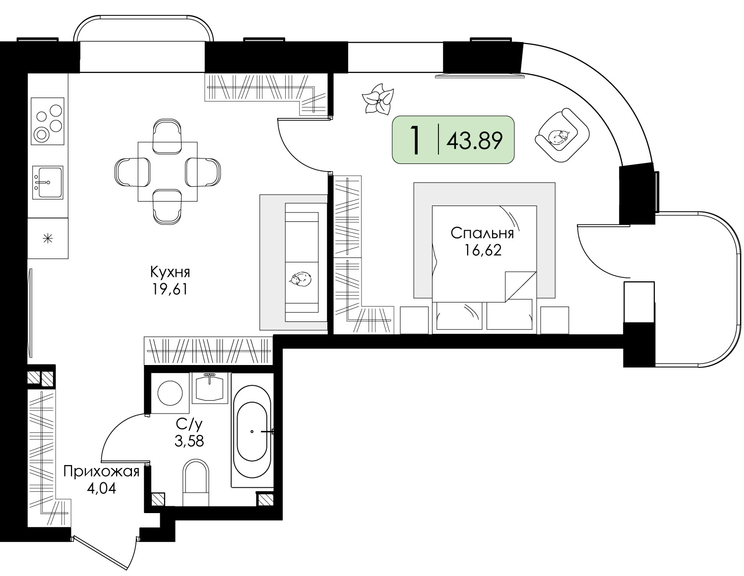 Однокомнатная квартира №115 с предчистовой отделкой, Корпус № 1.1, Секция 4
