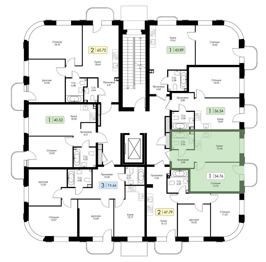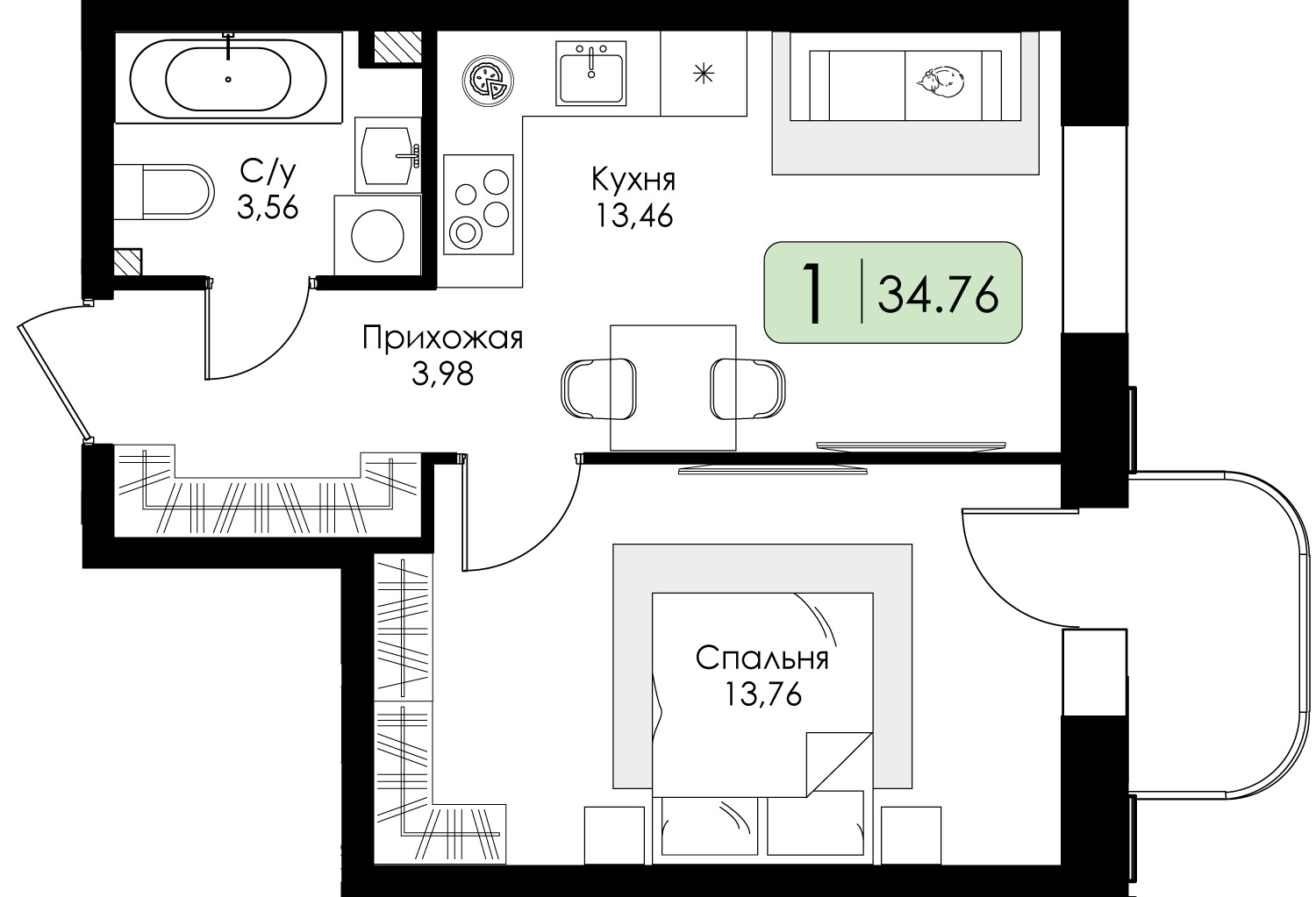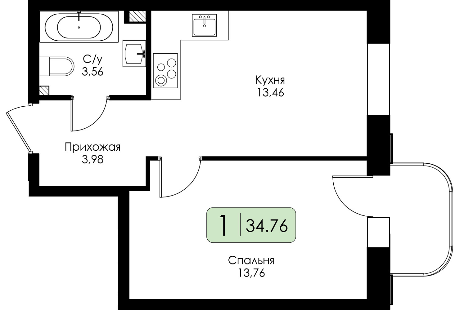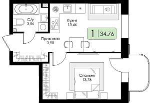 Однокомнатная квартира №117 с предчистовой отделкой, Корпус № 1.1, Секция 4