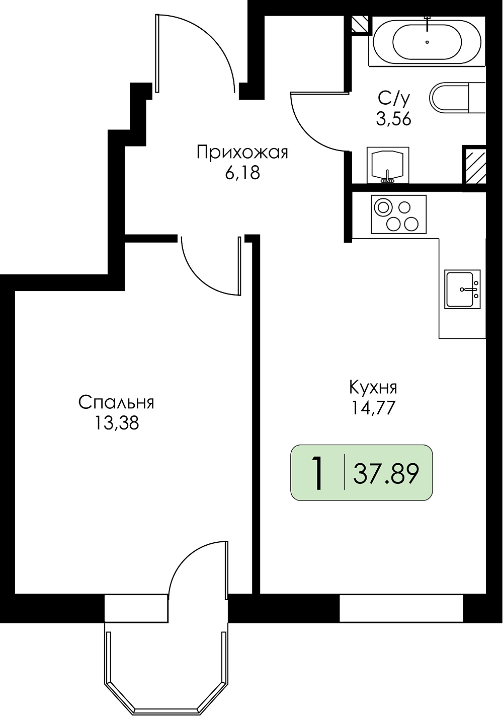 Однокомнатная квартира №148 с предчистовой отделкой, Корпус № 1.1, Секция 5